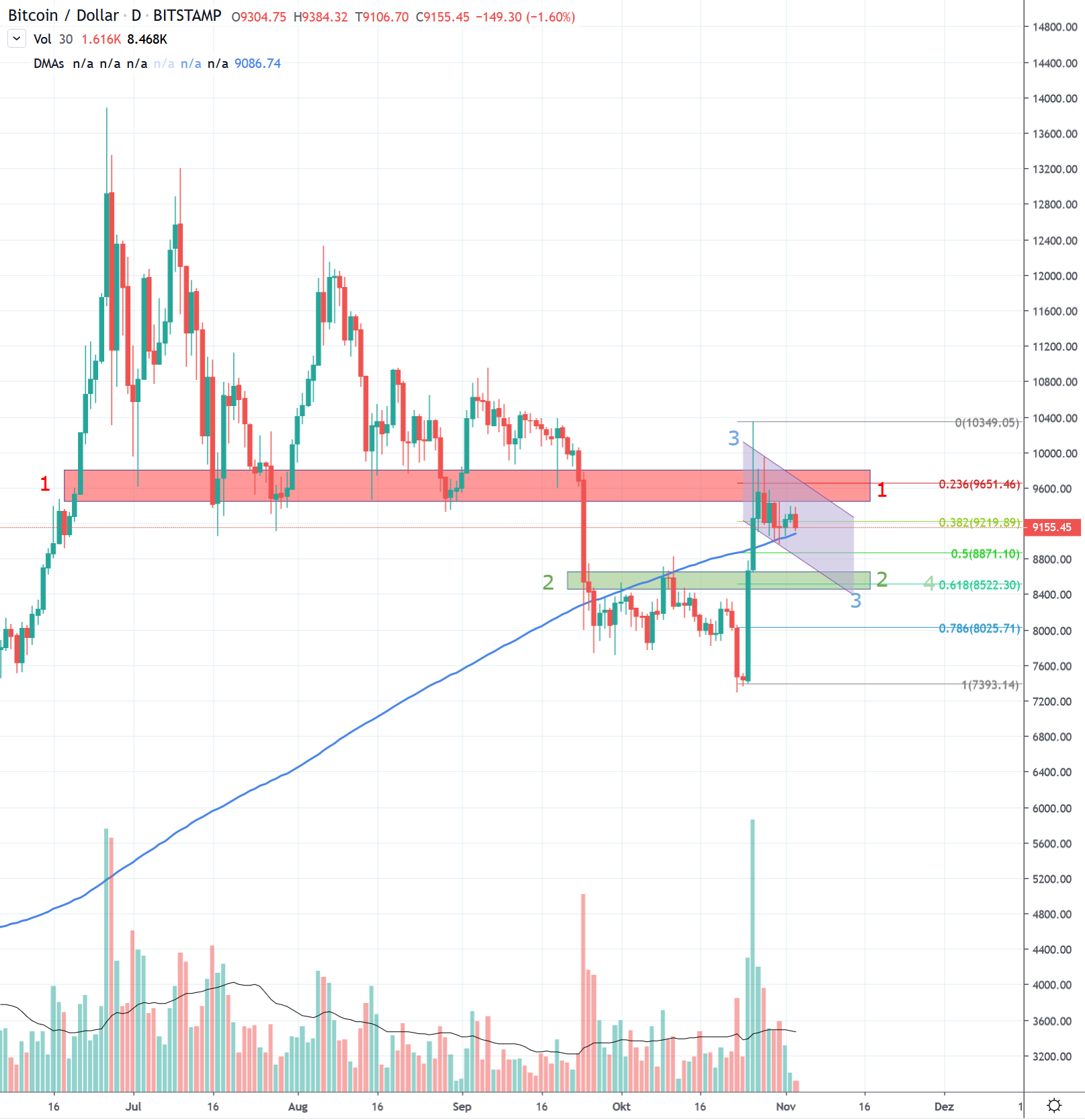 Die starken Widerstandszonen zwischen 9'300 und 9'600 USD (1), welche zuvor über mehrere Monate als Support dienten, müssen zukünftig nach oben durchbrochen werden, um das Makrobild nachhaltig auf optimistisch abzuändern. Passiert das bereits in den nächsten Tagen, wäre das eine ausgesprochen starke Bestätigung der erst einwöchigen Gegenbewegung. Allerdings würde auch eine Korrektur auf dem aktuellen Niveau die noch junge Gegenbewegung nicht negieren. Solange die Unterstützungszone durch die vorangegangenen Höchstände um 8'500 USD gehalten (2) werden, ist das technisch weiterhin positiv zu werten. Es würde in geordneten Bahnen eine Bullen-Flagge (engl.=Bullflag) Formation (3) entstehen. Eine positive Konsolidierung in einem Aufwärtstrend (oder aktuell sich neu formenden Aufwärtstrend). Im Bereich 8'500 USD befindet sich zusätzlich der 0.618 Fibonacci Punkt (4) der jüngsten Gegenbewegung, welcher als zusätzlicher Support dienen sollte. Erst ein Bruch dieser neuen Unterstützungszonen um 8'500 USD würde die jüngste Gegenbewegung in Frage stellen. Ein Testen der Marken unter 8'000 USD wäre ein schlechtes Zeichen und würde die noch junge Gegenbewegung negieren.