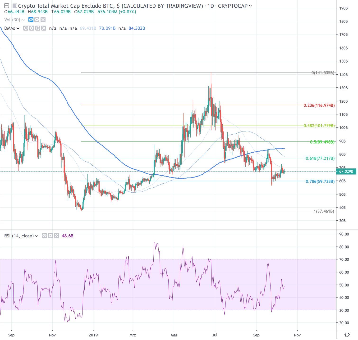Im Altcoinmarkt konnten in den letzten 7 Tagen vereinzelt beachtliche Kursbewegungen nach oben beobachtet werden. In den Top 20 Token nach Marktkapitalisierung gewichtet, konnten XRP (+9%), Binance (+14%) und Chainlink (+26%) zulegen. Auch im unteren Segment waren grössere positive Kursbewegungen zu beobachten. Die Gesamtmarktkapitalisierung ohne Bitcoin bewegt sich allerdings immer noch auf dem Niveau von rund 65 Mrd. USD knapp über dem 0.786 Fibonacci Punkt des Tiefpunktes vom Dezember 2018, sowie unter der 200 Tages Durchschnittslinie bei rund 83 Mrd. USD. Von einer breiten Bewegung zu sprechen wäre also definitiv verfrüht. Ein Anstieg der Gesamtmarktkapitalisierung Richtung der 78 Mrd. USD Marke um den 0.618 Fibonacci Punkt müsste als nächstes folgen. Bei einem Angriff auf die 200 Tages Durchschnittslinie bei 84 Mrd. USD wird eine Umkehr des negativen Trends wahrscheinlicher. Konsequenterweise müsste auch hier der Trend von Tieferen Höchstkursen gebrochen werden, um dann eventuell wie im Dezember, eine Vorreiterrolle für den Gesamtmarkt zu übernehmen.