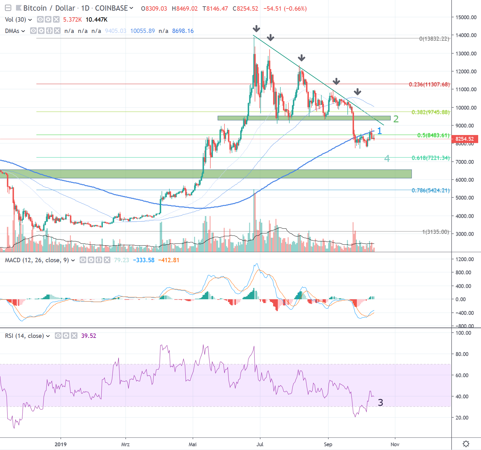 Das Makrobild wird weiterhin beherrscht durch die Serie von tieferen Höchstkursen seit Juni (Pfeile). Im wöchentlichen Intervall befinden wir uns unter der 21 wöchigen Durchschnittslinie. Beides ist negativ zu werten und macht vorerst ein Testen der unteren Unterstützungszone bei 7'000 USD beim "goldigen" 0.618 Fibonacci Punkt (4) wahrscheinlich.