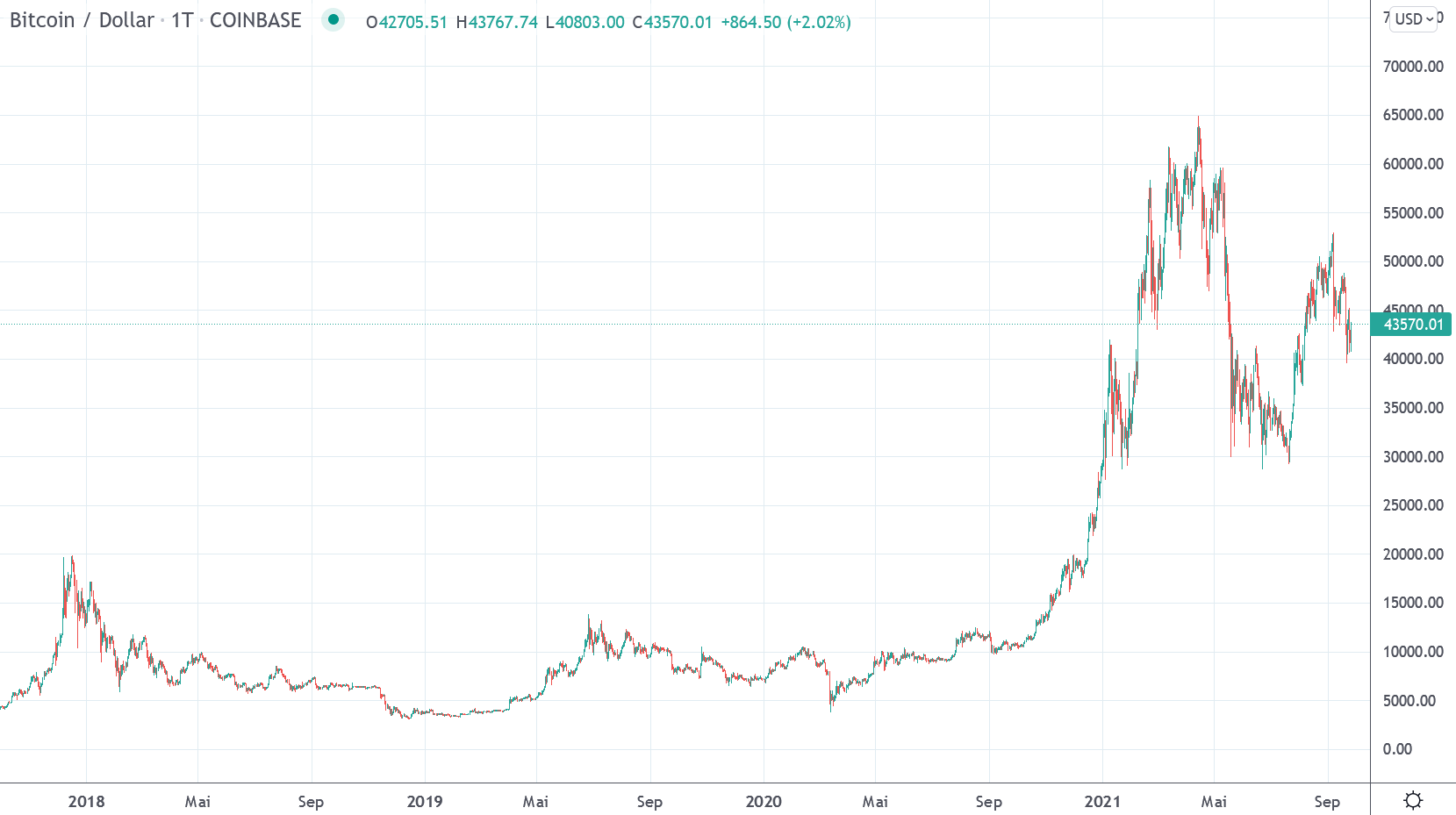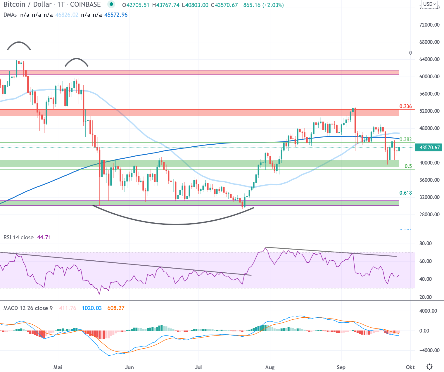 Wir befinden uns oberhalb des 11 Wochen anhaltenden Preiskorridors 30'000 - 40'000 USD. Ein "Roundig Bottom Szenario" im Bereich des 0.618 Fibonacci Punkt, der sich zwischen dem Start des rasanten Aufwärtstrends und dem neuen Allzeithoch berechnet, hat sich in einer starken Aufwärtsbewegung manifestiert. Die beeindruckende Gegenbewegung kam bestimmt und brachte Bitcoin direkt an die 50'000er Widerstände. Ein nachhaltiges Etablieren oberhalb dieses Bereichs scheiterte vorerst und führte zu einer happigen Preiskorrektur.