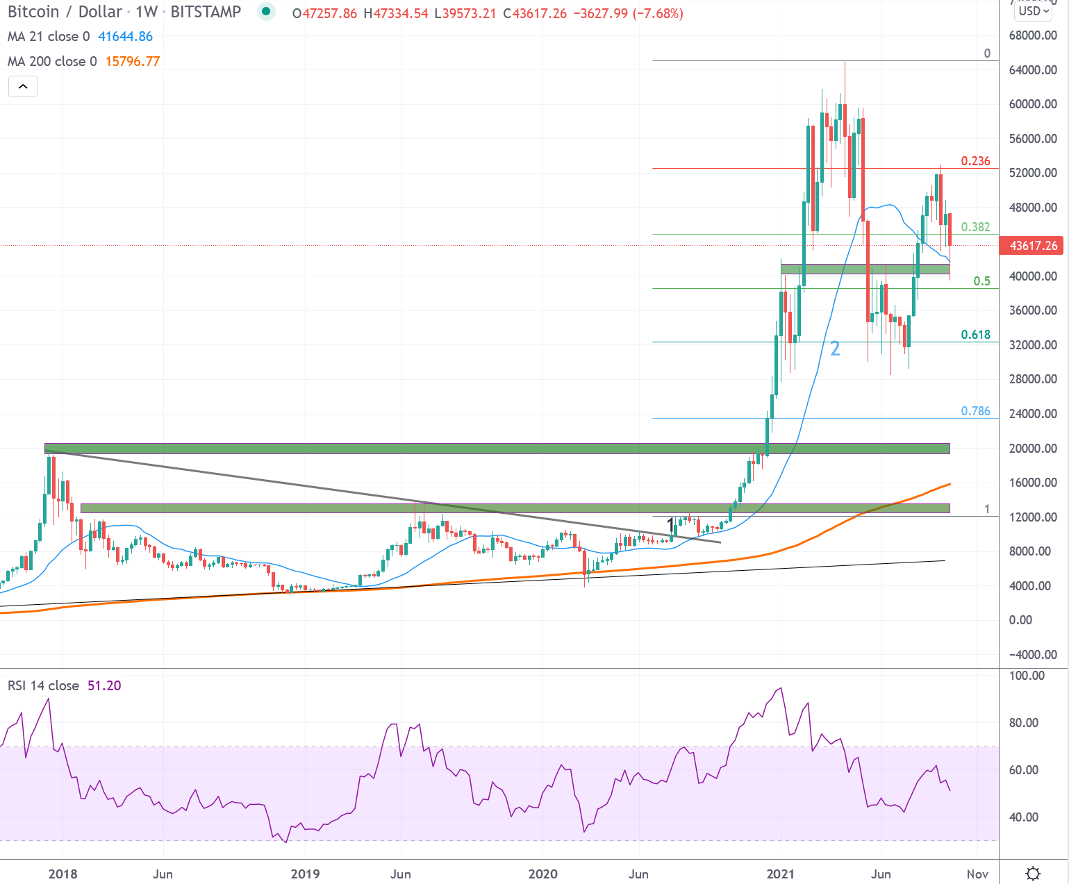 Mit dem Halten des 30'000er Supports in der 0.618 Fibonacci Zone bleibt ein Szenario einer sich fortführenden Preisentwicklung, welche schlussendlich über das bestehende Allzeithoch hinausführt, intakt. Ein solches Szenario wird durch Preisgeschehen oberhalb der 40'000er Supportzone und einer nachhaltigen Rückeroberung des 21-Wochendurchschnitts über die nächste Zeit bekräftig. Eine mutmassliche "Make it or break it" Situation zeichnet sich im aktuellen Preisgebiet in den nachfolgenden Wochen ab. Hier entscheidet der Markt, ob eine Preisfindung oberhalb des Allzeithochs stattfinden soll, oder ob die gegenwärtige Aufwärtsbewegung unterhalb des Allzeithochs in einer "Bullenfalle" wie im Januar 2018 endet.