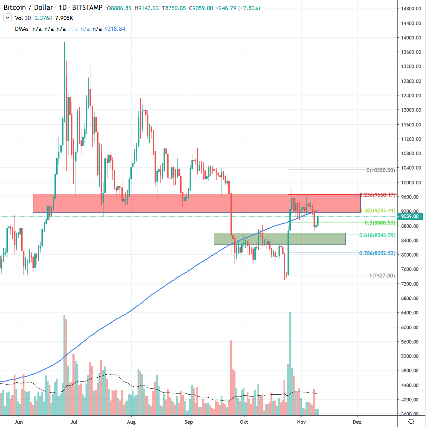 Es hat sich seit dem letzten Bericht nicht viel geändert. Gegen oben stellen ab 9'300 USD die zuvor über mehrere Monate als Unterstützung dienenden Punkte, eine starke Widerstandszone dar (1). Diese Widerstandszonen müssen zukünftig nach oben durchbrochen werden, um das Makrobild nachhaltig auf optimistisch abzuändern. Ein Durchbrechen dieser Widerstände würde auf eine Trendumkehr der seit Juni anhaltenden bärischen Phase hindeuten. Aber auch eine vorläufige Konsolidierung in diesem Raum wäre technisch gesehen kein schlechtes Zeichen. Wichtig dabei ist allerdings, dass die Unterstützung um 8'400 - 8'500 USD gehalten wird (2). Hier sollten die vorangegangenen Widerstandszonen der letzten Wochen, sowie der 0.618 Fibonacci Punkt der jüngsten Gegenbewegung für Unterstützung dienen. Ein Bruch dieser neuen Unterstützungszonen um 8'500 USD würde die jüngste Gegenbewegung in Frage stellen. Die letzte Unterstützungszone würde bei rund 8'100 in Form der seit Oktober geformten Unterstützungen, sowie mit dem 0.786 Fibonacci Punkt bestehen. Ein Testen der Marken unter 8'000 USD wäre ein schlechtes Zeichen und würde die noch junge Gegenbewegung negieren.