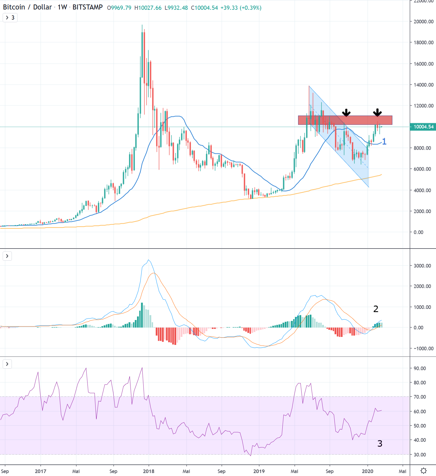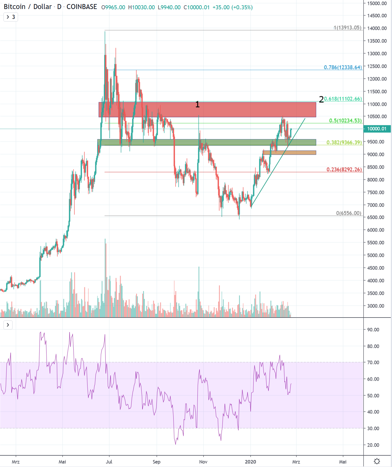 Wir kommen nun in eine Zone, welche stark durch frühere Preisbewegungen geprägt ist (rot). Zwischen Juni und September 2019 diente die Zone über 10'000 USD immer wieder als Unterstützung, bevor sie Ende September nach unten durchbrochen wurde. Auch diente sie zuletzt in der zweitägigen massiven Aufwärtsbewegung Ende Oktober bereits als Widerstand (1). Nun folgt also ein weiterer, nachhaltigerer Test als im Oktober. Eine erste Zurückweisung fand vorletzte Woche statt. Eine Konsolidierung oberhalb der Unterstützungszone zwischen 9'200 und 9'300 ist positiv zu werten und dürfte alsbald zu einem Neuen Angriff auf die jüngsten, neu geschaffenen Höchstkurse um 10'400 - 10'500 USD führen.