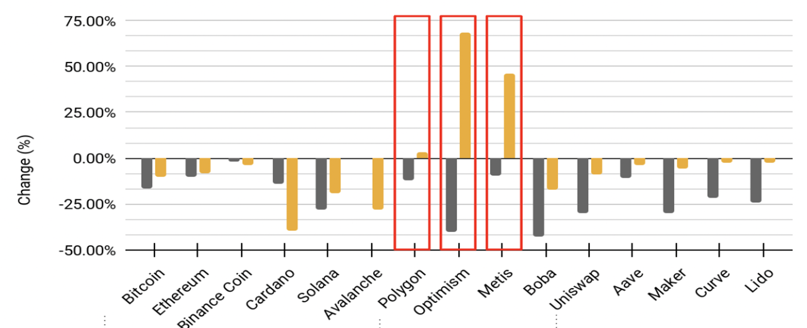 Die gesamte Marktkapitalisierung aller Kryptowährungen ist laut Daten von CoinMarketCap im Vergleich zum Vormonat um rund 10 Prozent gesunken. Der Rückgang folgte auf die restriktiven Massnahmen, die der Vorsitzende der Federal Reserve in seinen Reden in Aussicht gestellt hatte. Bitcoin (BTC) und Ethereum (ETH) fielen um 16.26% bzw. 10.1%. Wie in der Abbildung unten zu sehen ist, scheinen die drei Ausreisser des letzten Monats die Ethereum-Skalierungslösungen Optimism, Metis und Polygon zu sein. Sie haben im vergangenen Monat ein Wachstum der hinterlegten Vermögenswerte (TVL) von 68.23%, 46.35% bzw. 2.96% verzeichnet, wobei die Renditen angesichts des Rückgangs der zugrunde liegenden Vermögenswerte nicht positiv waren.