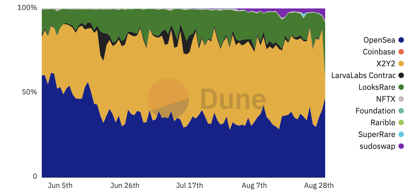 Die NFT-Marktplätze konnten sich der allgemeinen Marktstimmung nicht entziehen. Das Handelsvolumen von NFTs auf Ethereum ist im Vergleich zum Vormonat um 17.4% gesunken. Die folgende Abbildung zeigt, dass die Projekte OpenSea, X2Y2 und LooksRare die Top-3-Marktplätze auf Ethereum nach Volumen sind.