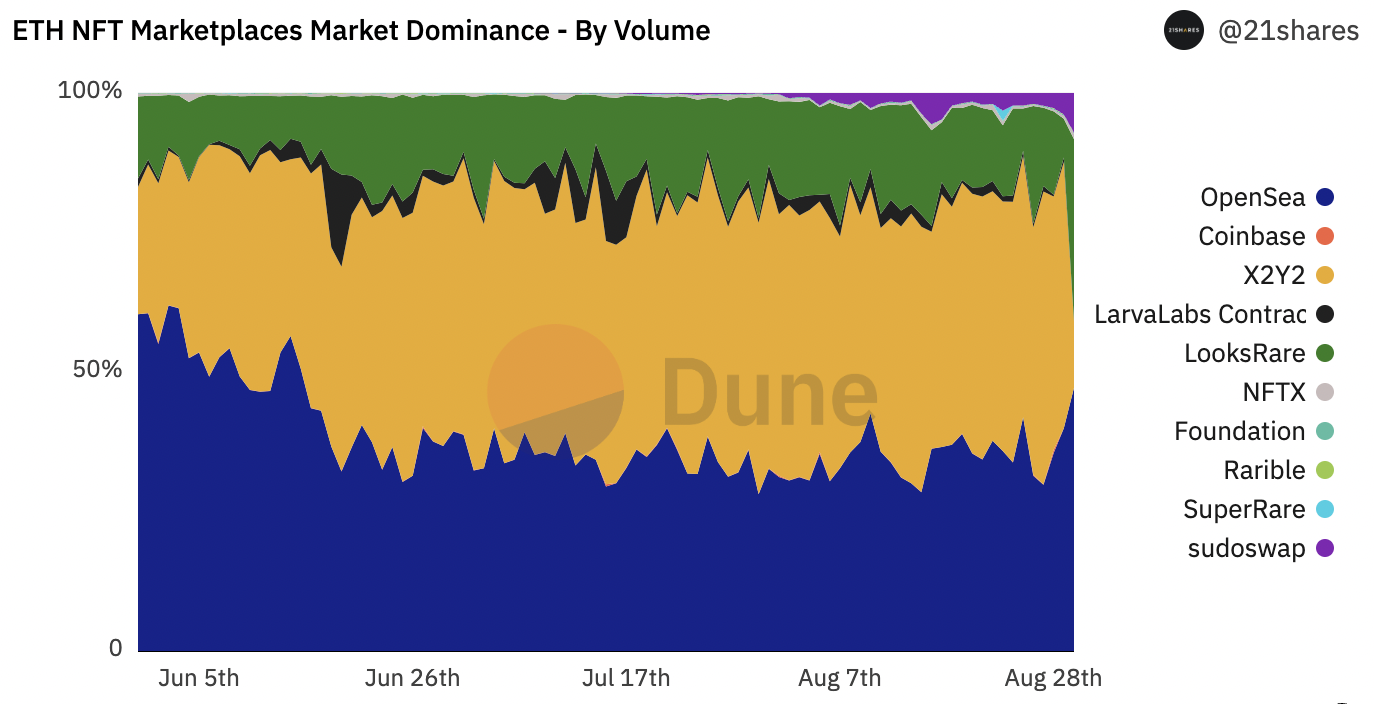 Die NFT-Marktplätze konnten sich der allgemeinen Marktstimmung nicht entziehen. Das Handelsvolumen von NFTs auf Ethereum ist im Vergleich zum Vormonat um 17.4% gesunken. Die folgende Abbildung zeigt, dass die Projekte OpenSea, X2Y2 und LooksRare die Top-3-Marktplätze auf Ethereum nach Volumen sind.