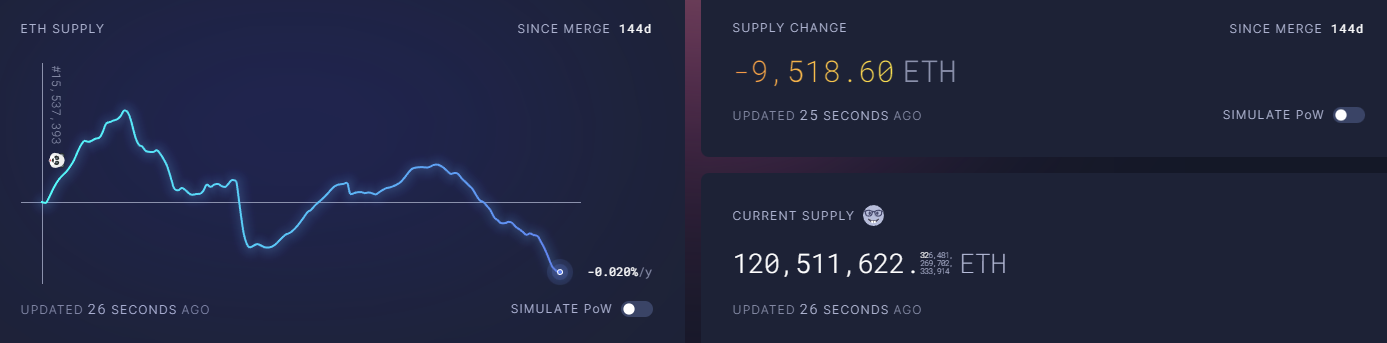 Seit dem Merge vom 15. September nähert sich die Angebotsänderung Ethers laut ultrasound.money nun -10'000 ETH. Das bedeutet, dass ETH allmählich zu einem deflationären Vermögenswert wird. Dies dank des sogenannten EIP1559: ein im August 2021 eingeführter Mechanismus, der einen Teil der für Transaktionsgebühren ausgegebenen Ether "verbrennt" (engl. = burn).