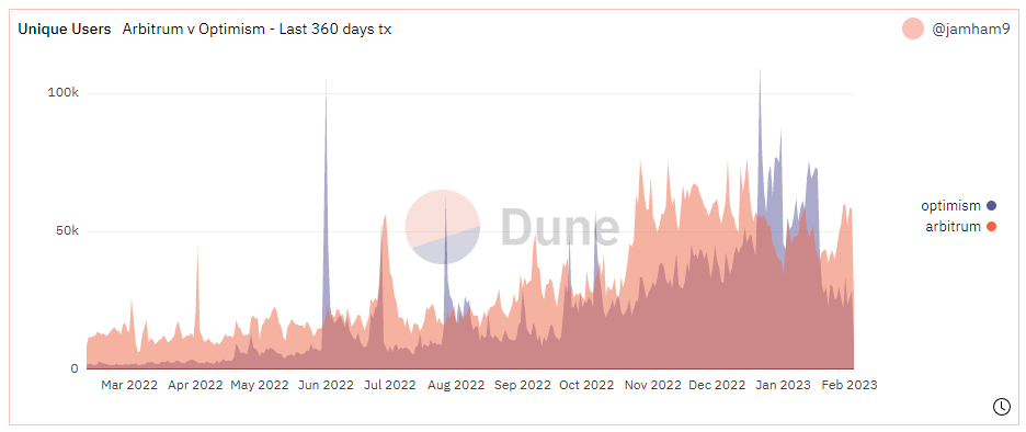 Aus dieser Sicht haben sowohl Arbitrum als auch Optimism die täglichen Transaktionen Ethereums in der zweiten Januarhälfte übertroffen. Obwohl der Fortschritt durch eine Reihe von Netzwerkverbesserungen beider Netzwerke vorangetrieben wurde, erlitten die täglichen Transaktionen Optimisms nach Abschluss seiner "Quests" einen starken Einbruch. Eine Bekräftigung unserer These, dass Arbitrum genau im Auge behalten werden sollte. Denn die Layer 2 Lösung konnte ihrem Ökosystem ohne exorbitante Anreize in Form von Token-Emissionen organische Traktion und eine loyale Nutzerbasis sichern.
