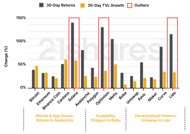Die nachlassende Inflation in den USA drehte die Marktstimmung zu Gunsten von Risiko-Assets wie Kryptowährungen - trotz Gegenwind durch die Insolvenz von Genesis und eine Strafverfolgungsklage gegen Bitzlato. In den letzten 30 Tagen sind Bitcoin (BTC) und Ethereum (ETH) um fast 40% bzw. 30% gestiegen. Der Ausreisser war Solana (SOL) mit einem Plus von 140%, was teilweise auf den Hype des Meme-Token "BONK" zurückzuführen ist. Optimism stach im Bereich der Skalierungslösungen heraus und stieg um 132%. Was die dezentralen Finanzanwendungen (DeFi) betrifft, so ist der Token-Preis der "Staking-as-a-Service-Plattform" Lido im vergangenen Monat um 117% gestiegen.