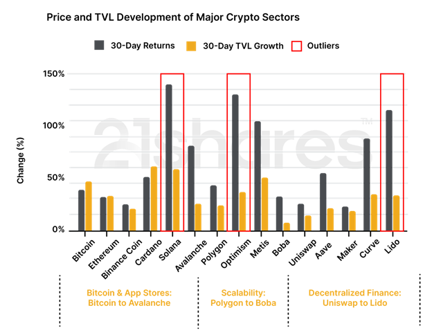 Die nachlassende Inflation in den USA drehte die Marktstimmung zu Gunsten von Risiko-Assets wie Kryptowährungen - trotz Gegenwind durch die Insolvenz von Genesis und eine Strafverfolgungsklage gegen Bitzlato. In den letzten 30 Tagen sind Bitcoin (BTC) und Ethereum (ETH) um fast 40% bzw. 30% gestiegen. Der Ausreisser war Solana (SOL) mit einem Plus von 140%, was teilweise auf den Hype des Meme-Token "BONK" zurückzuführen ist. Optimism stach im Bereich der Skalierungslösungen heraus und stieg um 132%. Was die dezentralen Finanzanwendungen (DeFi) betrifft, so ist der Token-Preis der "Staking-as-a-Service-Plattform" Lido im vergangenen Monat um 117% gestiegen.