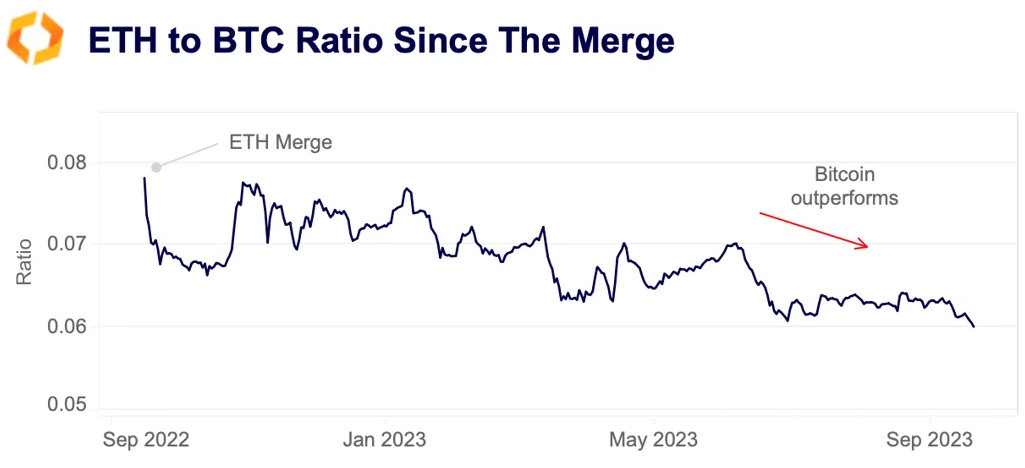 Letztes Jahr um diese Zeit lag das Verhältnis von ETH zu BTC bei knapp 0.08, nachdem ETH im Vorfeld der Merge gegenüber BTC zugelegt hatte. Seitdem ist das Verhältnis jedoch weiter gesunken, zunächst von 0.08 auf 0.07 im ersten Quartal 2023 und dann von 0.07 auf 0.06 in diesem Sommer. Die Gründe dafür sind vielfältig, aber es könnte mit der Erwartung des Marktes zusammenhängen, dass die SEC bald einen BTC-ETF auf Kassabasis genehmigen wird, während ein ETH-ETF in weiter Ferne liegt.