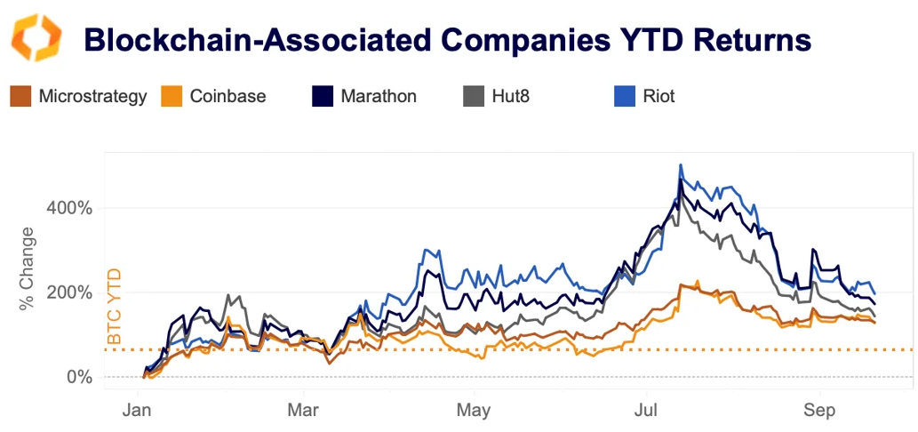 Obwohl sie einen Teil ihrer Gewinne vom Juli verloren haben, übertreffen die meisten Bitcoin-Miner weiterhin den BTC-Spot und andere Blockchain-assoziierte Unternehmen im bisherigen Jahresverlauf. Riot Platforms - einer der grössten BTC-Miner in Texas - ist im Jahresvergleich um atemberaubende 197% gestiegen, nachdem sie im August einen Rekordgewinn von 31 Mio. USD aus Stromgutschriften erzielt haben. Marathon Digital ist um 173% gestiegen, während Hut 8 um 145% zugelegt hat. Coinbase und Microstrategy haben sich ebenfalls besser entwickelt als der BTC-Kassakurs und sind in diesem Jahr um rund 130% gestiegen, was auf den Optimismus der ETFs zurückzuführen ist. Während die Einführung der Ordinals im Februar die Gebühreneinnahmen der Miner in die Höhe trieb, stiegen die Hash-Rate und die Netzwerkschwierigkeiten weiter an und belasteten die Branche.