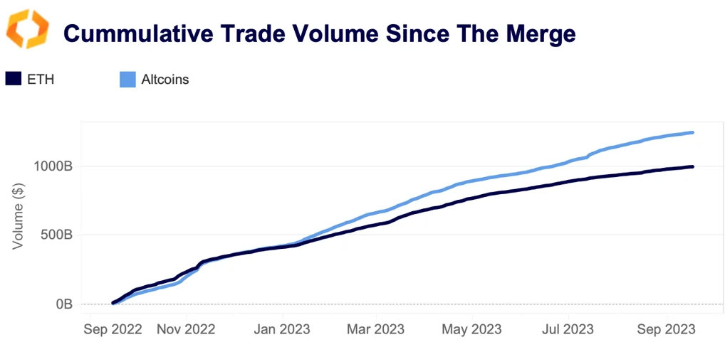 Der Einbruch von ETH spiegelt sich auch in den Handelsvolumina wider, die im vergangenen Jahr unverändert schwach geblieben sind. Die Grafik unten zeigt die laufende Summe des ETH- und des kombinierten Top-30-Altcoin-Volumens. Von September 2022 bis Januar 2023 waren die beiden Volumina nahezu identisch. Als die Märkte dann im Januar begannen, sich zu erholen, begannen die Altcoins ETH zu überholen, und der Abstand ist seither weiter gewachsen. Die Top-30-Altcoins haben im gezeigten Zeitraum ein Volumen von fast 1.5 Mrd. USD im Vergleich zu 1 Mrd. USD für ETH verzeichnet.