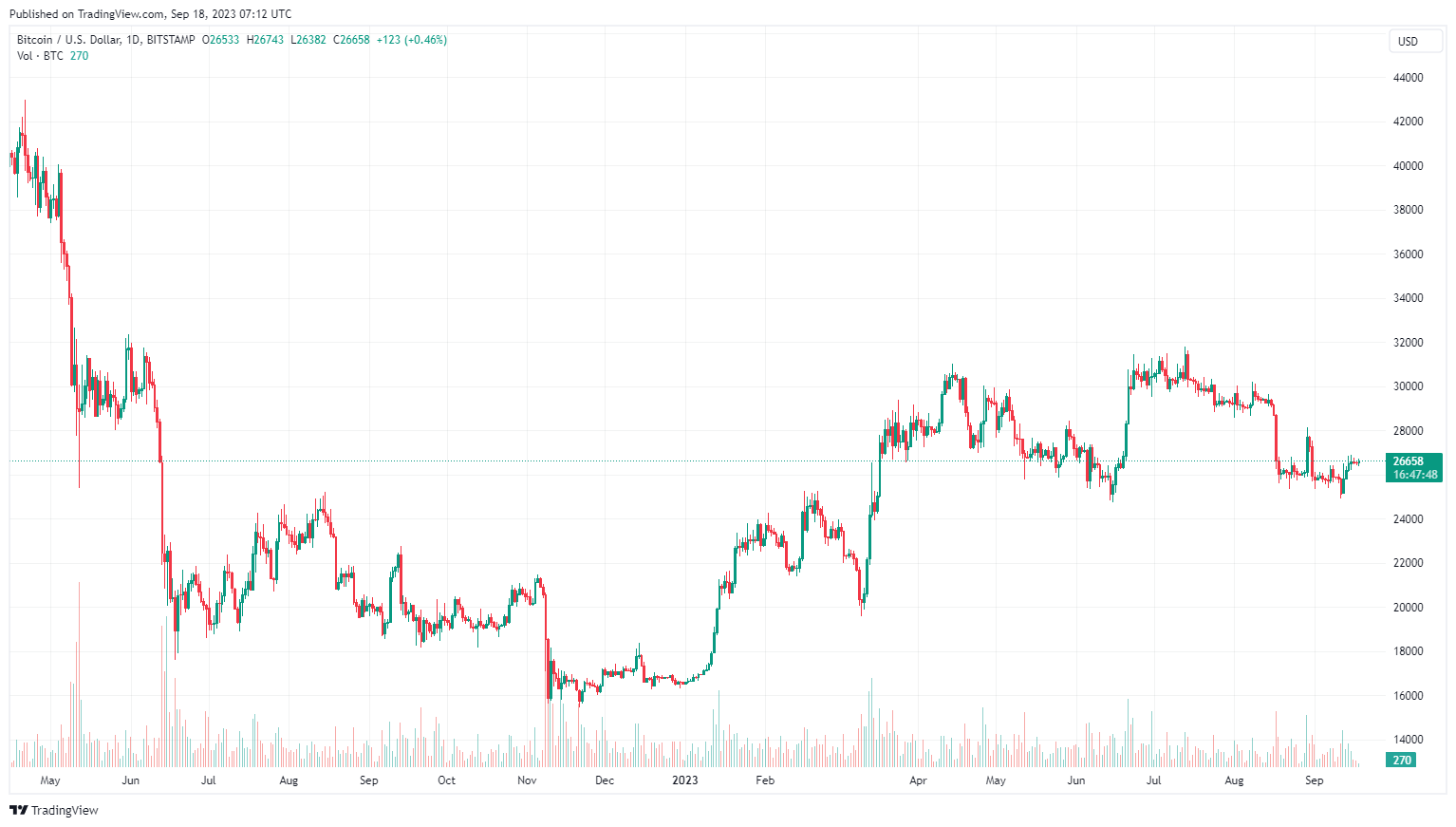 Mitte August suchte eine scharfe Korrektur die Krypto-Märkte heim und drückte Bitcoin knapp -20% unter den jüngsten lokalen Höchststand. Eine darauffolgende Konsolidierung im Bereich 26'000 USD führte den Preis der Kryptowährung kurzfristig an historische Unterstützungen. Über die letzten Tage erfolgte dann eine leichte Erholung (+7.07%).