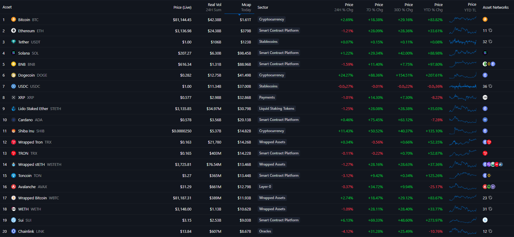 Die Gewinner der Woche sind Dogecoin (+88.36%), Cardano (+75.45%) und Sui (+69.33%). Ausser Tron (-0.22%) und Toncoin (+9.42%) erzielten alle Kryptowährungen in der Top 20 einen Wochengewinn im zweistelligen Prozentbereich. Ethereum übertraf Bitcoins Preisanstieg mit +28.09% gegenüber +18.38%, wobei die zweitgrösste Kryptowährung im Jahresvergleich nach wie vor hinterherhinkt.