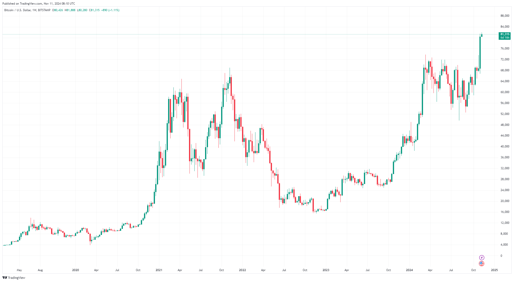 Letzte Woche verlieh der Sieg des Präsidentschaftskandidaten Donald Trump den Krypto-Märkten einen erheblichen Schub. Am Tag des Wahlergebnisses schoss der Bitcoin-Preis auf ein neues Allzeithoch von 75'000 USD. Die Krypto-freundliche Agenda des künftigen Präsidenten verspricht ein deutlich freundlicheres Umfeld für digitale Assets in den nächsten vier Jahren. Der Preisanstieg nach der Wahl verlangsamte sich aber keineswegs - im Gegenteil. Über das Wochenende stieg der Bitcoin-Preis weiter auf 81'000 USD.