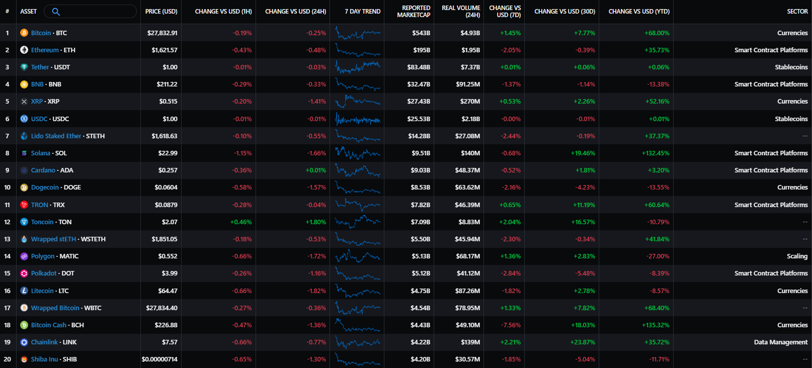 Das Bild sieht bei den alternativen Kryptowährungen (Altcoins) ähnlich aus. Nur fünf der Top 20 Kryptowährungen nach Marktkapitalisierung hatten eine grüne Woche. Und auch diese Preissteigerungen fielen im tiefen einstelligen Prozentbereich aus. Chainlink (LINK) war mit +2.21% "Top-Performer" der vergangenen sieben Tage. Abwärtsbewegungen blieben ebenfalls begrenzt. Bitcoin Cash (BCH) war mit -7.56% ein leichter Ausreisser.