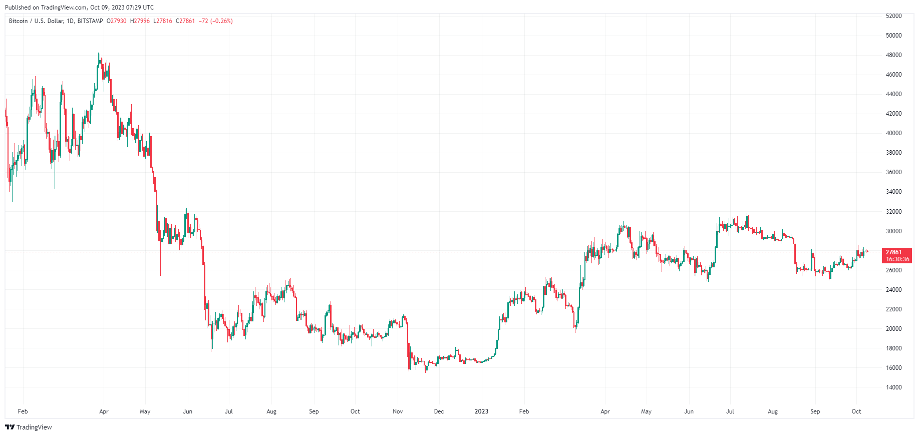 Die Volatilität der Krypto-Märkte befindet sich nach wie vor auf historischen Tiefstständen. Selbst einige traditionelle Märkte wie Öl verzeichneten über die vergangenen drei Monate stärkere Preisschwankungen. Der nächste Katalyst für Bitcoin wäre eine SEC-Entscheidung bezüglich dem ersten Spot-basierten Bitcoin-ETF. Bis dann ist eine weitere Konsolidierung der Krypto-Preise als wahrscheinlich einzustufen.