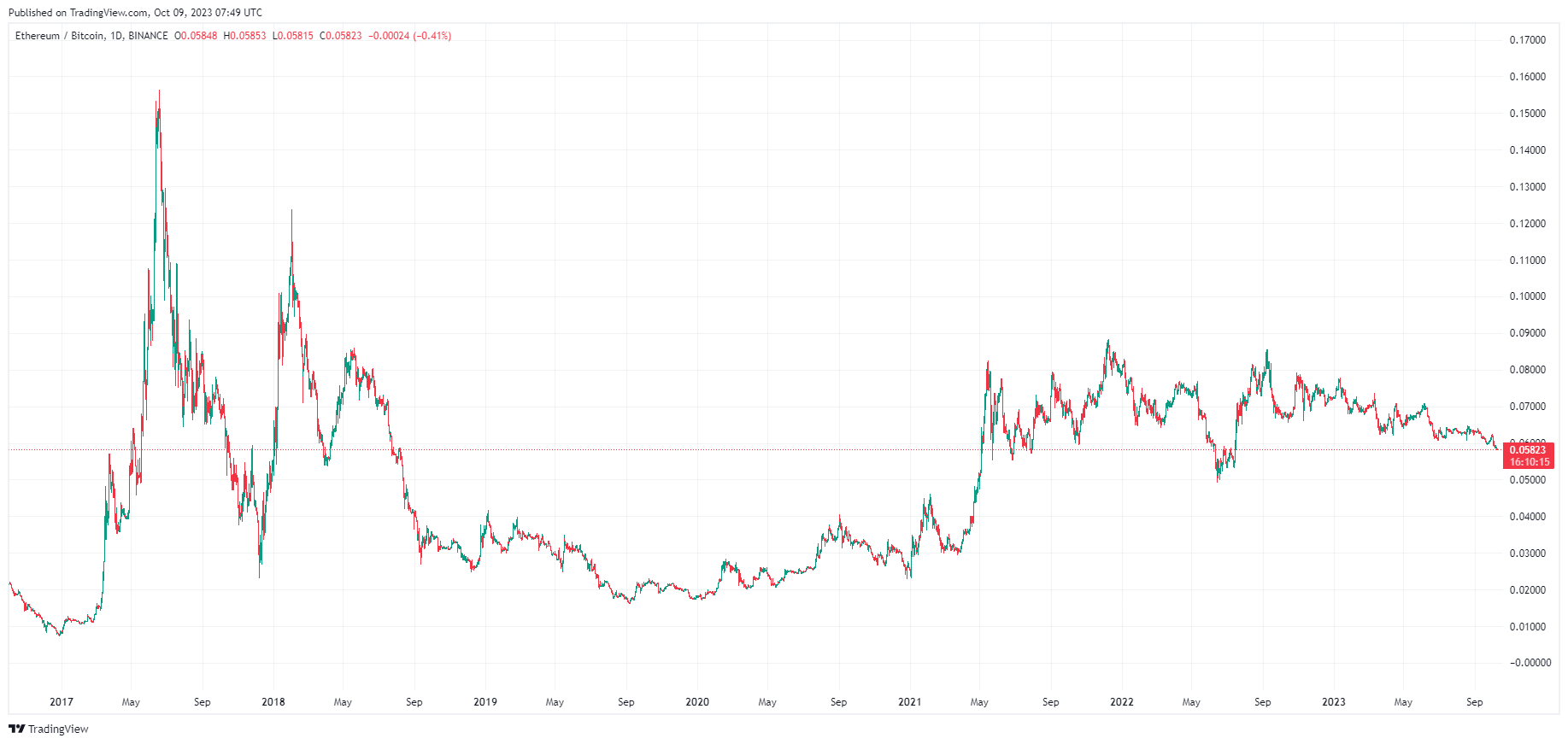Händler preisten das Debüt dementsprechend negativ ein. Das Verhältnis zwischen Ether und Bitcoin (ETH/BTC) wird aktuell auf Niveaus gehandelt, die seit Sommer 2022 vor dem lang erwarteten Merge nicht mehr erreicht wurden. Dies geht mit einem sinkenden Risikoappetit einher, der sich oft in einem tieferen ETH/BTC-Verhältnis äussert.
