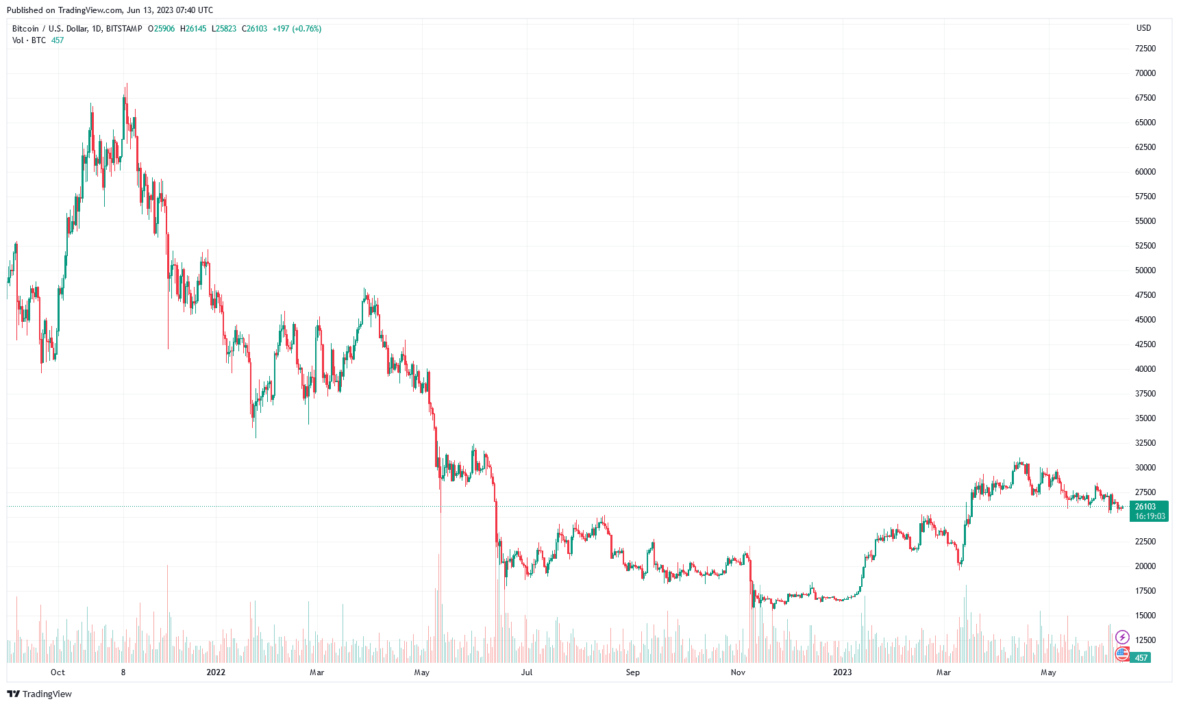 Diese Pause sollte jedoch nicht mit dem Ende der Straffungsmassnahmen verwechselt werden. Händler gehen derzeit davon aus, dass die Fed die Zinsen auf ihrer Juli-Sitzung um weitere 25 Basispunkte anheben wird. Ähnlich wie bei den vorherigen Turbulenzen bei Kryptowährungen in den letzten Jahren werden die Spotpreise von Kryptowährungen derzeit von idiosynkratischen Risikofaktoren getrieben. Der Schwerpunkt liegt auf ihrem dezentralen Charakter und der Frage, ob sie als Wertpapiere gelten.