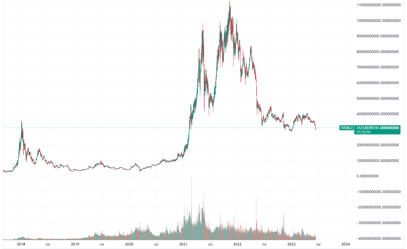 Über digitalen Vermögenswerten schwebt eine dunkle Wolke und sollten sie in den USA und möglicherweise auch in Europa in die Kategorie der Wertpapiere fallen, würde dies einen kurzfristigen Liquiditätsschock bzw. einen Einwegmarkt verursachen. Es würde zu einem drastischen Rückgang der Marktpreise führen. Abgesehen davon liegt die Gesamtmarktkapitalisierung von Kryptowährungen ohne BTC und ETH derzeit bei 311.94 Mrd. USD auf einem Level nach dem FTX-Vorfall. Dies signalisiert einen günstigen Zeitpunkt für langfristige Anleger in Kryptowährungen, um in den Markt einzusteigen.