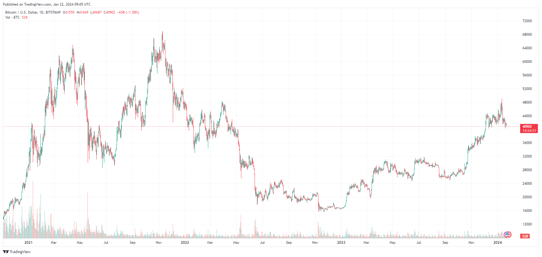Wie die meisten lang erwarteten Ereignisse markierte der Start der ersten Spot-basierten Bitcoin-ETFs in den USA den lokalen Höchststand für den BTC-Preis. Die starke Rallye seit Mitte 2023 legt jetzt eine wohlverdiente Verschnaufpause ein.Diese Konsolidierung nach der starken Vorfreude auf die ETFs ist zu begrüssen. Denn bereits vor der Genehmigung waren einige Anzeichen einer Überhitzung der Märkte zu beobachten.