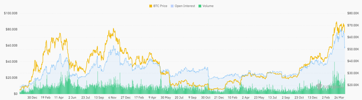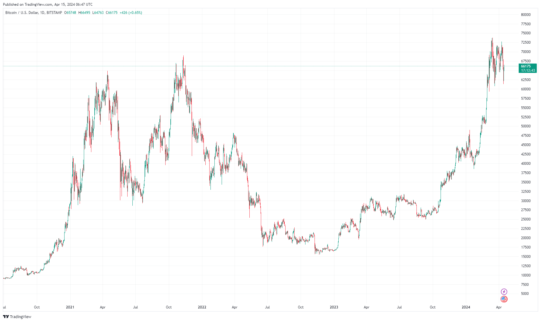 Eine Schlagzeile zu einem Angriff des Irans auf Israel führte zu einem Impuls zurück an das alte Allzeithoch um 60'000. Bitcoin korrigierte um rund -17%. Ungeduldige Derivatehändler erlitten erhebliche Verluste. Über 600 Millionen USD an Bitcoin-Positionen wurden über die vergangenen Tage liquidiert. Mittlerweile hat sich BTC leicht erholt. Den Konflikt zwischen Iran und Israel überschätzten Krypto-Händler scheinbar.