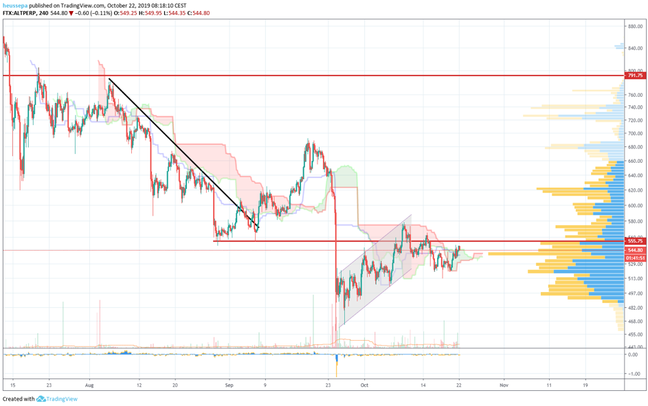 Um dieses bärige Setup aufrechtzuerhalten, müssen wir unter dem letzten Höchststand von 565$ bleiben und unter das jüngste Tief von 513$ sinken. Ich denke, dass die Wahrscheinlichkeit weiterer Abwärtsbewegungen eher gering ist, wenn man bedenkt, dass die Ichimoku-Clould im vergangenen Monat fast wöchentlich von bullig auf bärig wechselte.