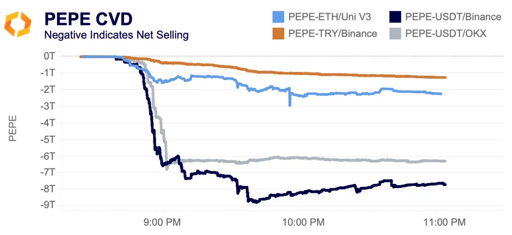 Der Memecoin PEPE stürzte innerhalb weniger Stunden um 20% ab, nachdem Beobachter auf der Blockchain feststellten, dass das Pepe-Team die Parameter seiner Multi-Signatur-Wallet (Multi-Sig) geändert hatte. Dadurch konnten sie Token im Wert von etwa 15 Mio. USD an Börsen senden, wobei der Grossteil an OKX und Binance ging. Unser Diagramm des kumulativen Volumendeltas (CVD) zeigt die Nettokäufe und -verkäufe auf jedem Instrument, wobei etwa 12 Billionen PEPE netto in nur 15 Minuten verkauft wurden, als das Team Token absetzte. Innerhalb einer Stunde waren netto 19 Billionen Token verkauft worden. Interessanterweise ist die Liquidität trotz des Preisverfalls an den zentralen Börsen stabil geblieben, mit 300'000 USD mehr Geboten als Anfragen innerhalb von 0.5% des mittleren Preises.