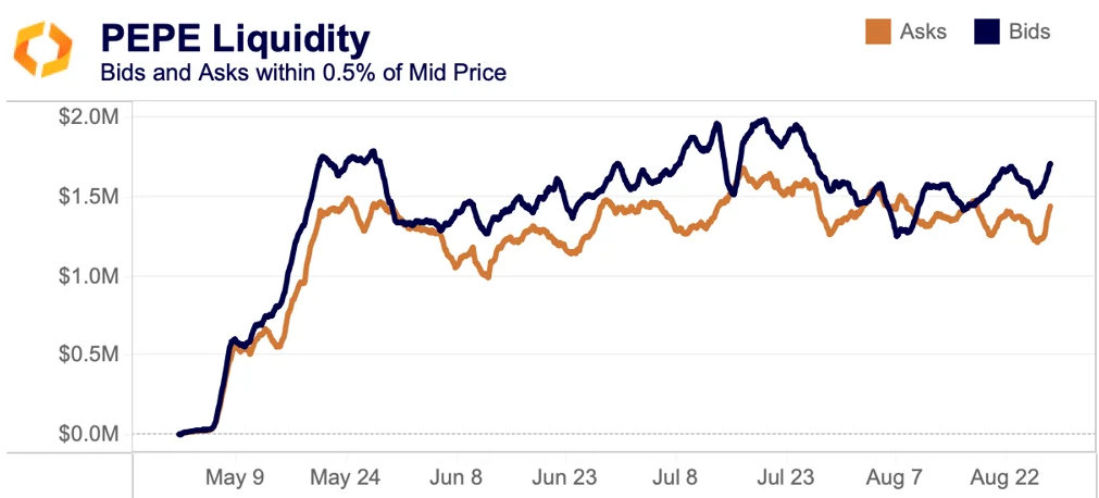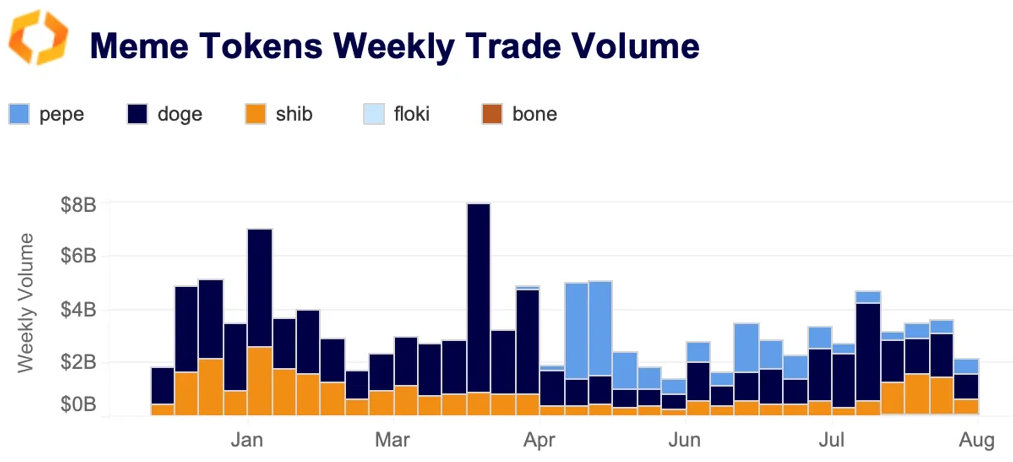 PEPE hat die Märkte nach seiner Einführung im April im Sturm erobert, wobei das wöchentliche Handelsvolumen im Mai ein Allzeithoch von 4 Mrd. USD erreichte, bevor es im Juli auf etwa 0.4 Mrd. zurückging. Trotz des Ausverkaufs in der letzten Woche blieb das PEPE-Handelsvolumen sowohl in USD als auch in nativen Einheiten deutlich unter dem Jahresdurchschnitt.