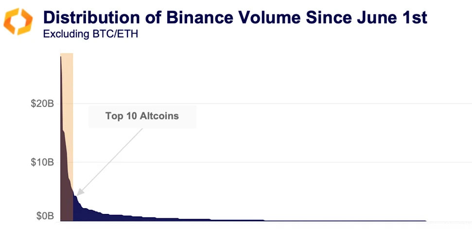 Market-Making ist bei Krypto-Projekten üblich, wenn nicht sogar erwartet, um die Liquidität für einen Token zu gewährleisten, was die allgemeine Handelserfahrung verbessert. Binance hat derzeit mehr als 380 Vermögenswerte, die an der Börse gehandelt werden, viele von ihnen sind sehr illiquide. Ein Blick auf die Verteilung des Handelsvolumens zeigt, dass die überwiegende Mehrheit innerhalb der Top-10-Altcoins liegt (mit Ausnahme von BTC/ETH, die insgesamt den Grossteil des Volumens ausmachen).