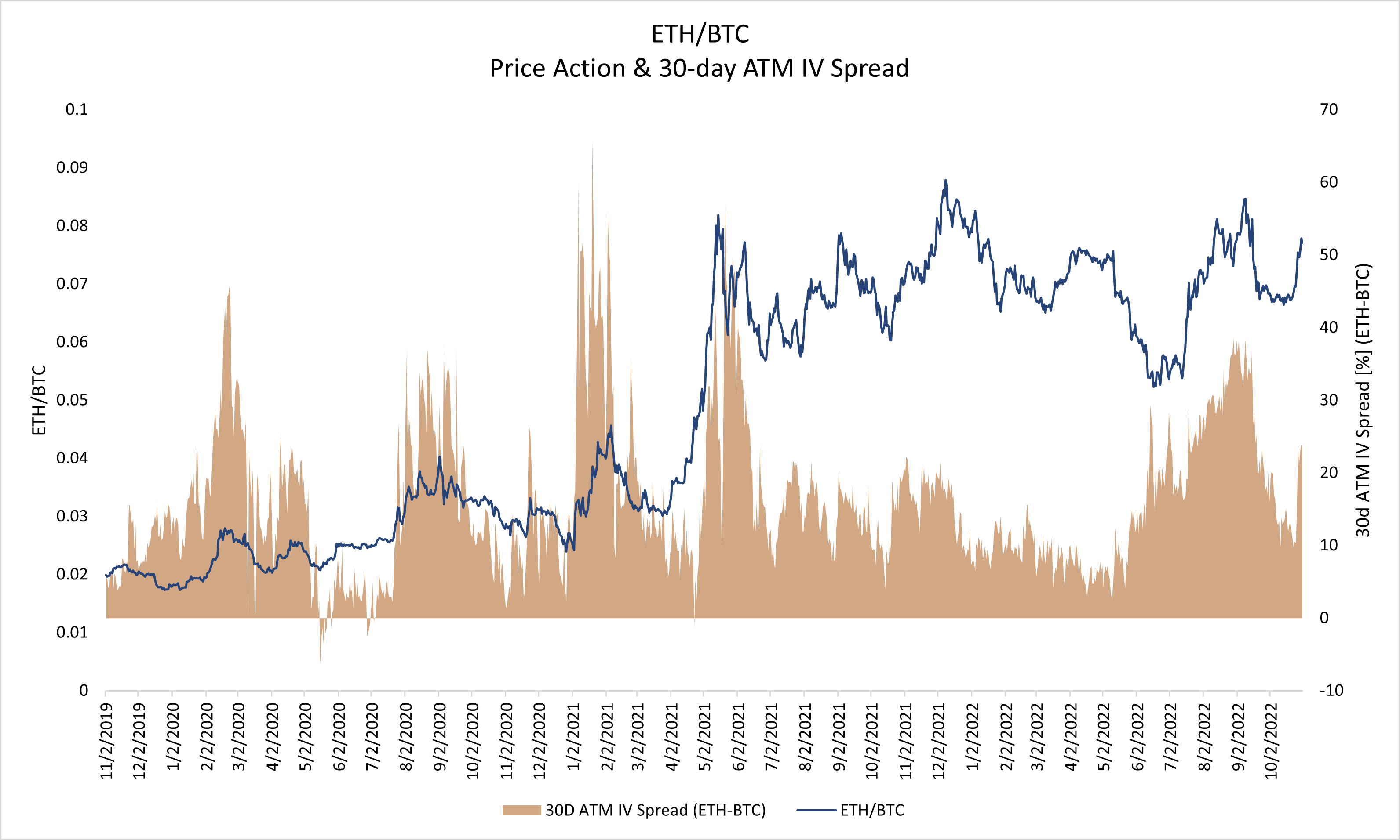 - ETH/BTC könnte bald bei 0.08 gehandelt werden - wenn die derzeitige positive Stimmung anhält; andernfalls wird das Paar auf 0.07 zurückgehen. Derivatehändler setzen auf einen höheren ETH- und einen niedrigeren BTC-Kurs, da sich der Spread bei den impliziten Volatilitäten ausweitet (derzeit: +23 Vols). In der Vergangenheit war ein höherer Spread gleichbedeutend mit einer überdurchschnittlichen ETH-Performance. Mal sehen, ob dieser Trend anhält.