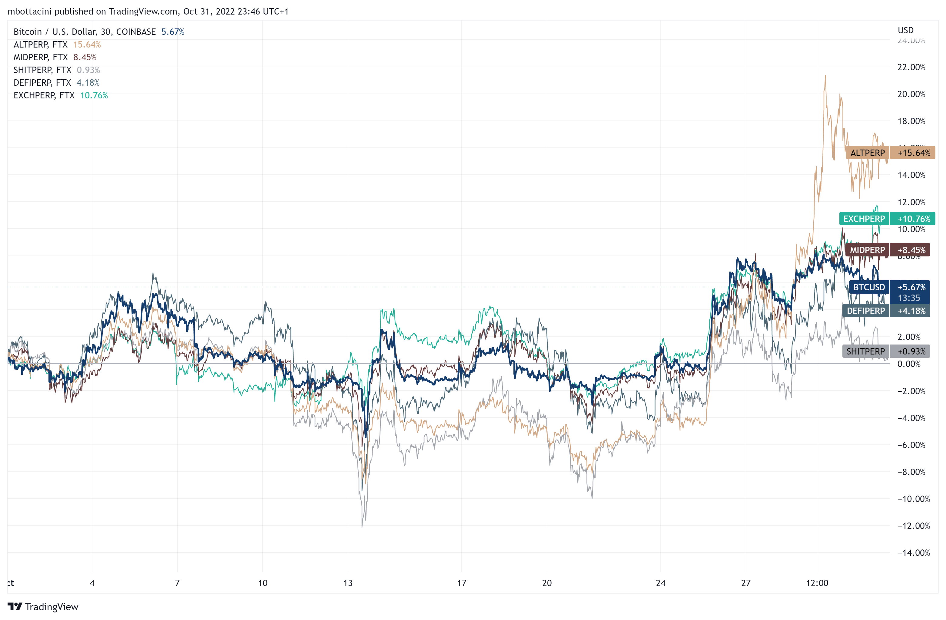 Alts haben im Oktober die Führung bei den digitalen Vermögenswerten übernommen. Der ALT-Index ist im Monatsvergleich um 15% gestiegen, wobei auch Börsentoken weiterhin gut abschneiden (+10% im Monatsvergleich). BTC (+5.67%) folgt immer noch den US-Aktien, die um 6.9% gestiegen sind.