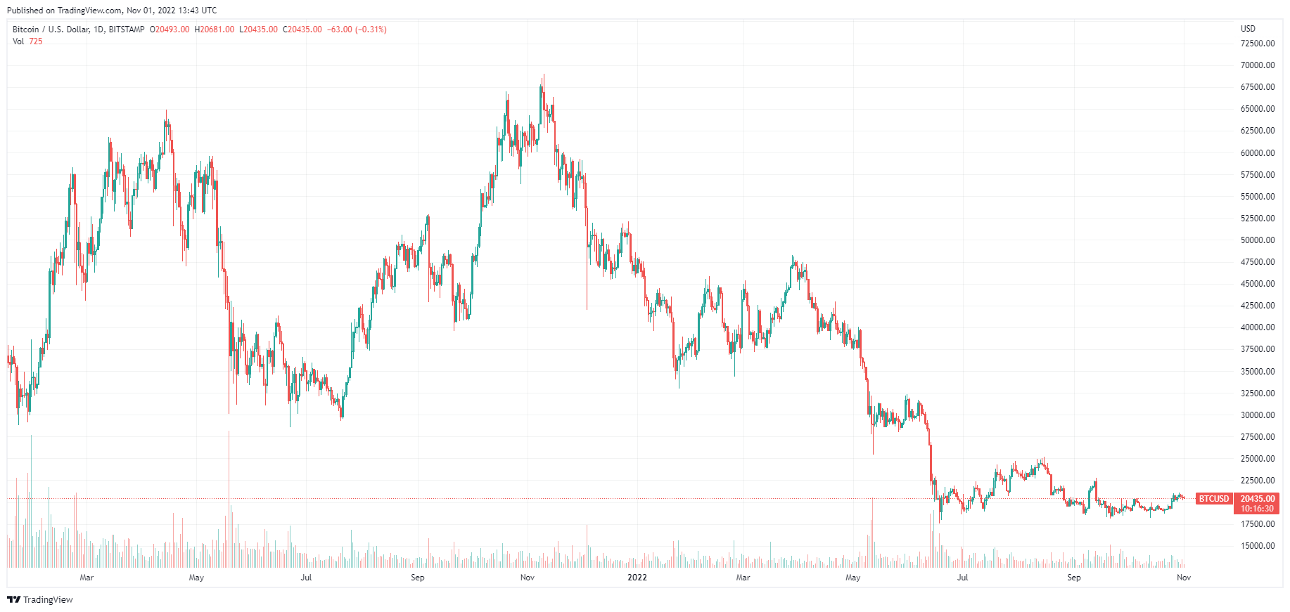 - BTC (derzeit: 20'470 USD; +5.6 % MoM) konnte erneut die Marke von 21'000 USD nicht halten und flirtet mit 20'000 USD.