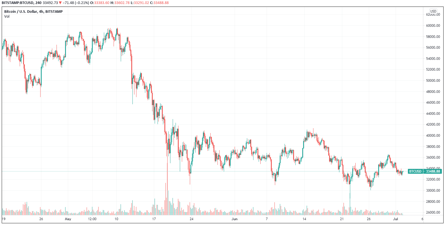 Insgesamt wurde der Markt in einer engeren Spanne gehandelt. Bitcoin (BTC) bewegte sich von 33'000 USD auf 36'500 USD und wieder zurück auf 33'000 USD. Ethereum (ETH) hat sich während der gesamten Woche besser entwickelt als BTC und der Spread zwischen den beiden stieg um fast 10% an. ETH/BTC wird nun bei 0.062 gehandelt.
