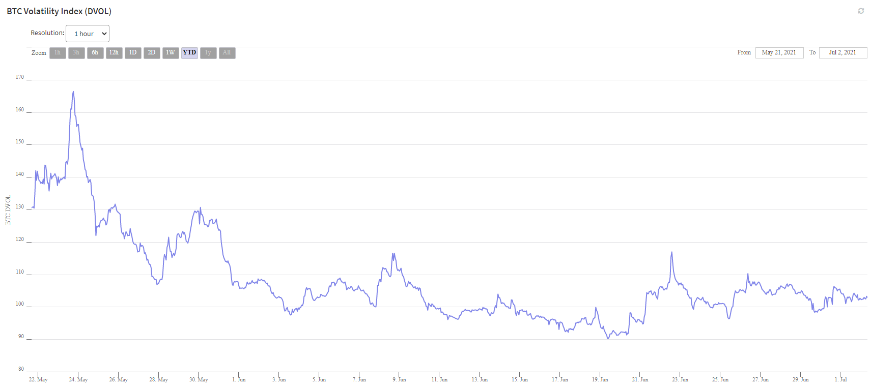 Der DVOL-Index drückt die einfache Exposure gegenüber der reinen impliziten Volatilität aus und verwendet das implizite Volatilitäts-Smile der relevanten Verfallsdaten, um eine Zahl auszugeben, die ein Mass für die 30-tägige annualisierte implizite Volatilität darstellt. Ein identisches und vergleichbares Produkt auf dem traditionellen Finanzmarkt ist der CBOE Volatility Index VIX, der ein Echtzeit-Marktindex ist und die Erwartungen des Marktes für die Volatilität in den kommenden 30 Tagen darstellt.