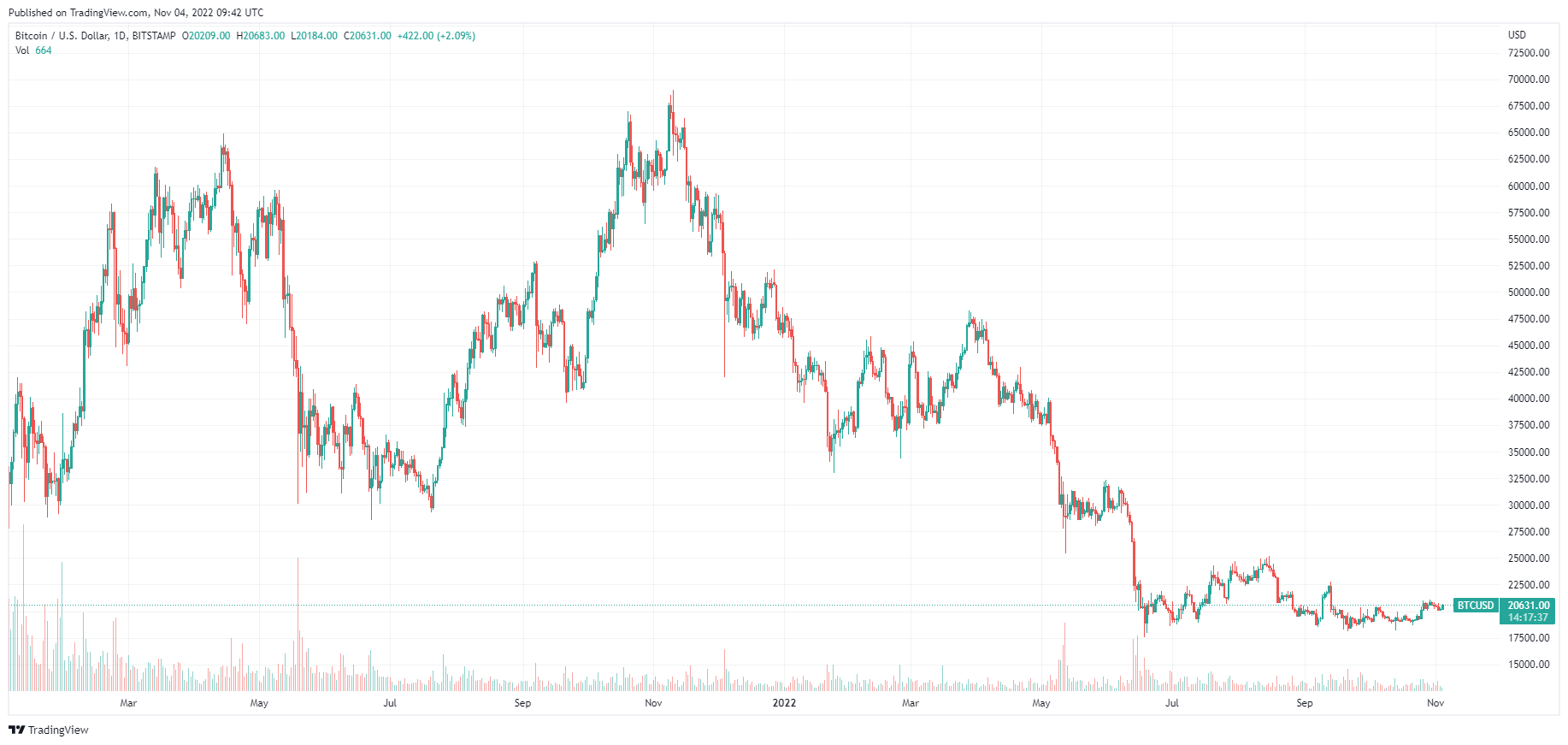 Positiv zu vermerken ist, dass Diskussionen über eine Verlangsamung der Zinserhöhungen auf der nächsten oder übernächsten Sitzung aufkommen könnten. Eine Anhebung um 50 Basispunkte am 14. Dezember hat derzeit eine Wahrscheinlichkeit von 47.2%. Die Verbraucherpreisindex (VPI) Zahlen der nächsten Woche werden weitere Anhaltspunkte liefern. Die Aktienkurse stiegen nach dem Ereignis zunächst an, bevor sie bis zum Börsenschluss fielen. BTC und ETH folgten, konnten aber nach Börsenschluss einige Verluste aufholen.