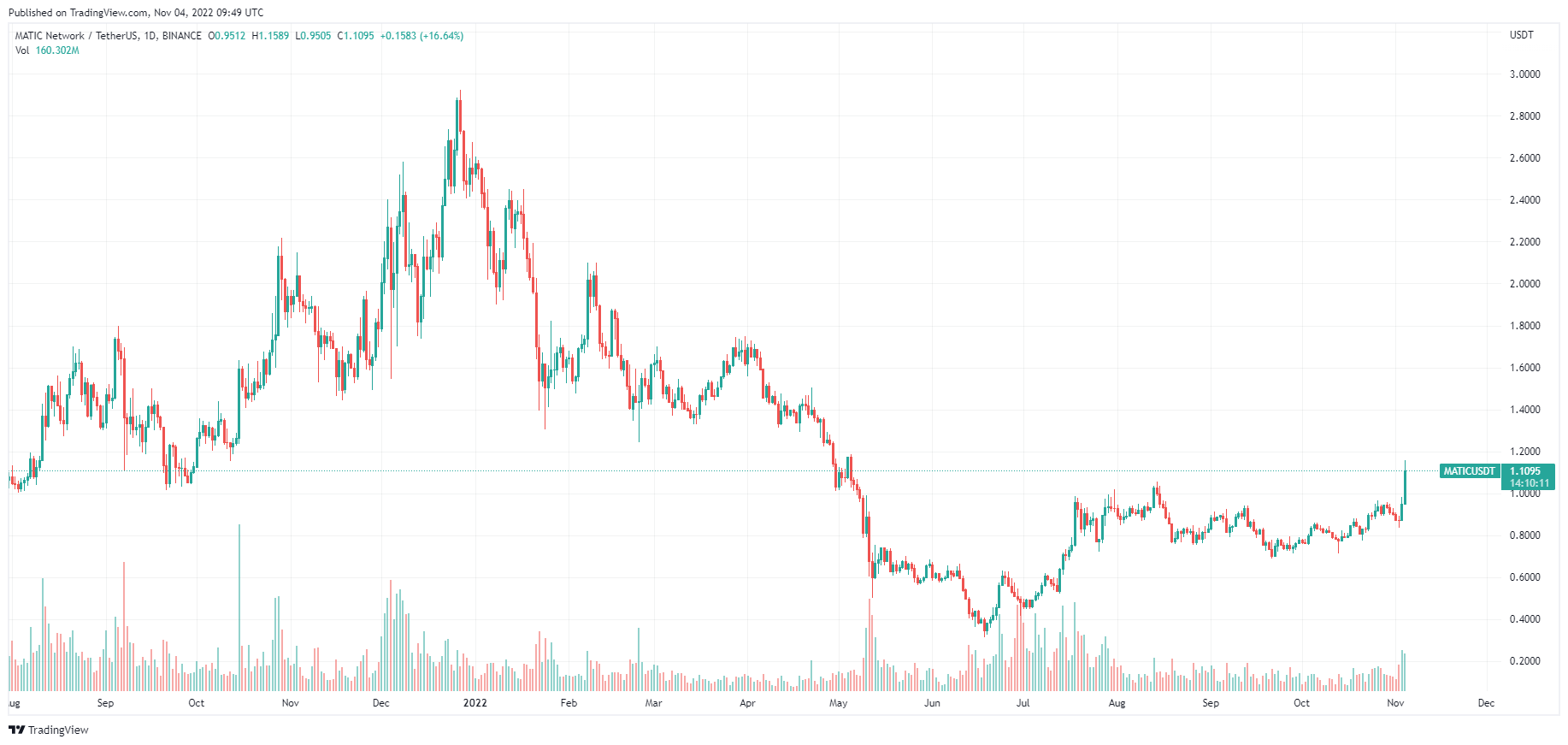 In den letzten 24 Stunden ist MATIC um fast 17% gestiegen. Meta gab am Mittwochabend bekannt, dass ihre Instagram-Nutzer digitale Sammlerstücke als NFTs auf dem Polygon-Netzwerk prägen, ausstellen und handeln können. Ausserdem sollen die Sammlerstücke auf Arweave gespeichert werden. Der Kurs des nativen Coins AR stieg nach dieser Nachricht um 47%. Andere Speichernetzwerkprojekte wie Filecoin (FIL) und Ocean Protocol (OCEAN) folgten diesem Beispiel und schlossen Donnerstag mit +11% und +33% ab.
