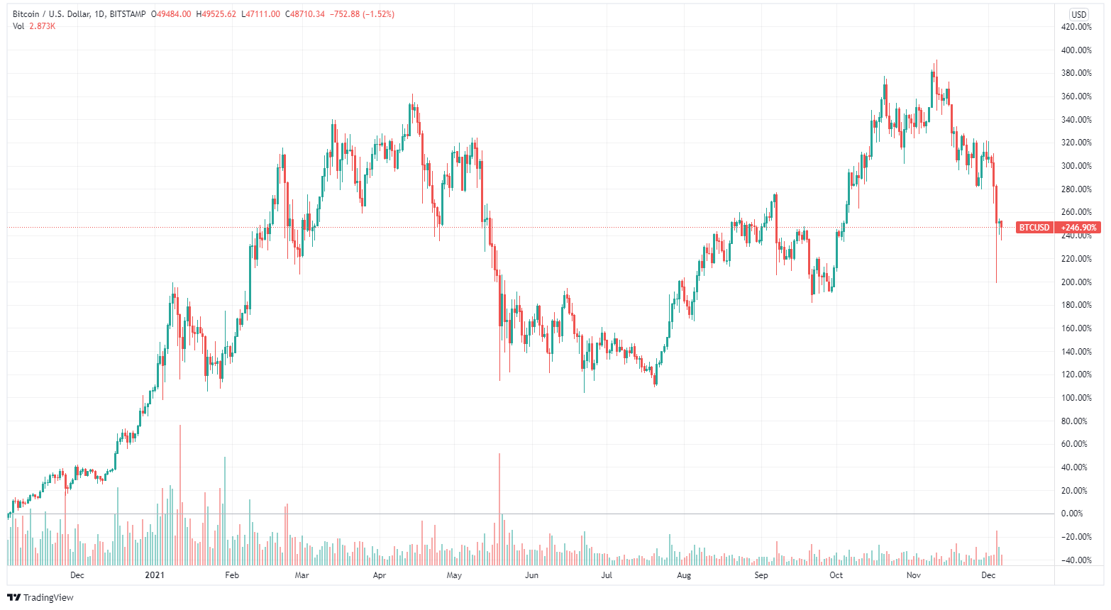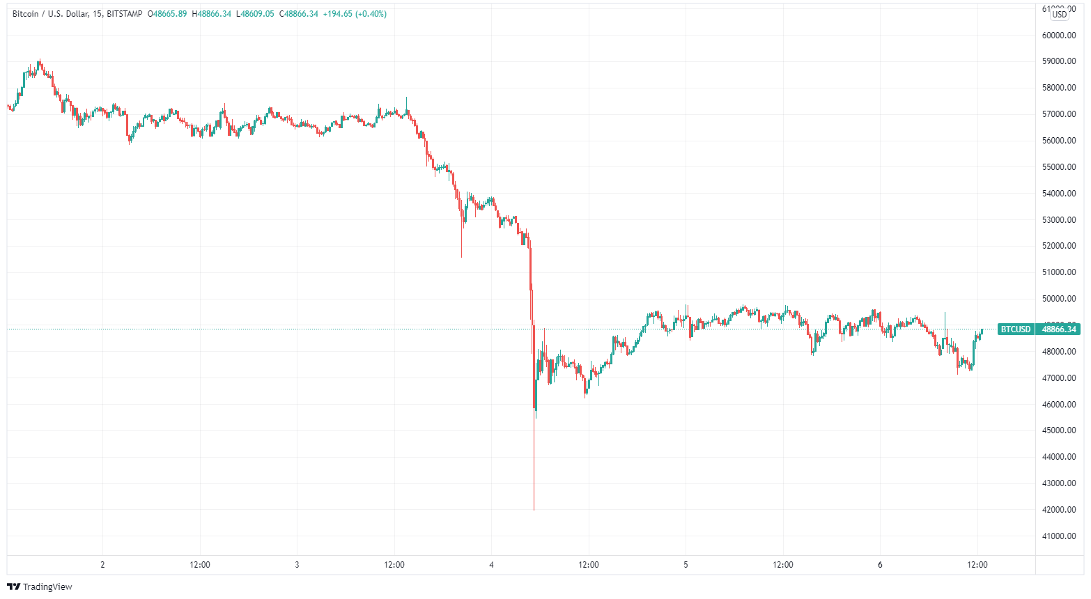 Dann, so glaube ich, zog das Blut auf den Strassen die Haie an. Der Markt beruhigte sich etwa 15-20 Minuten lang, und dann kam das hohe Volumen, begleitet von weiteren Liquidationen, und wir erreichten den Tiefststand von etwa 41-42'000 USD (je nachdem, an welcher Börse Sie den Preis überprüfen).