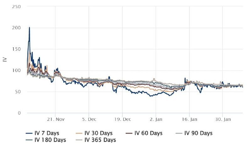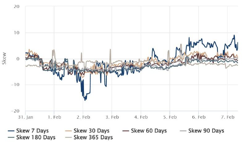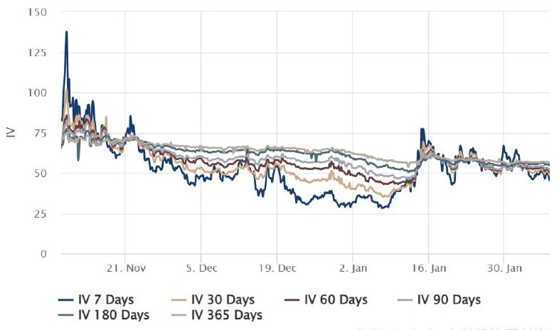 Sollte sich der Spotpreis weiterhin in einer Spanne bewegen, werden die beiden Term-Strukturen steiler, angeführt von 7- und 30-Tage-Rückgängen. Wie letzte Woche bin ich eher ein Freund von Verkäufen und von Volatilität, solange BTC und ETH keine klaren Unterstützungen bzw. Widerstände durchbrechen. Bei einem Ausbruch über 25k USD für BTC und 1.7k USD für ETH würde ich besser Long-Delta kaufen. Bei einem Ausbruch unter 22.5k USD für BTC und 1.5k USD für ETH würde ich besser Short-Delta kaufen.