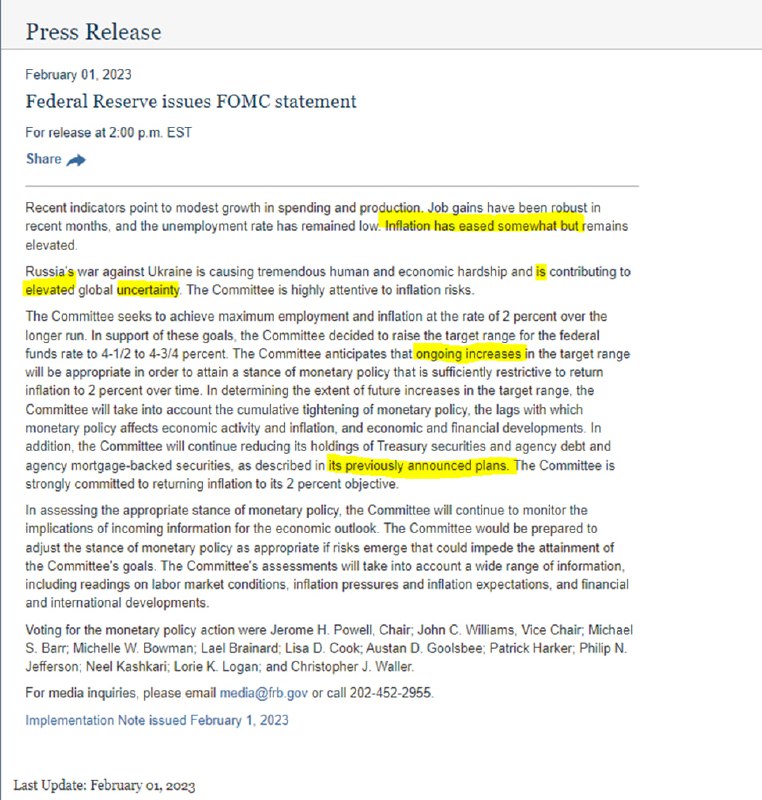 Am Mittwoch beschloss das FOMC eine Zinserhöhung um 25 Basispunkte und schickte die Märkte auf Risiko. Wenn ich mir die Veröffentlichung Wort für Wort ansehe, gibt es dennoch einige Aussagen, die ich besonders interessant finde (wie in der Abbildung unten hervorgehoben):