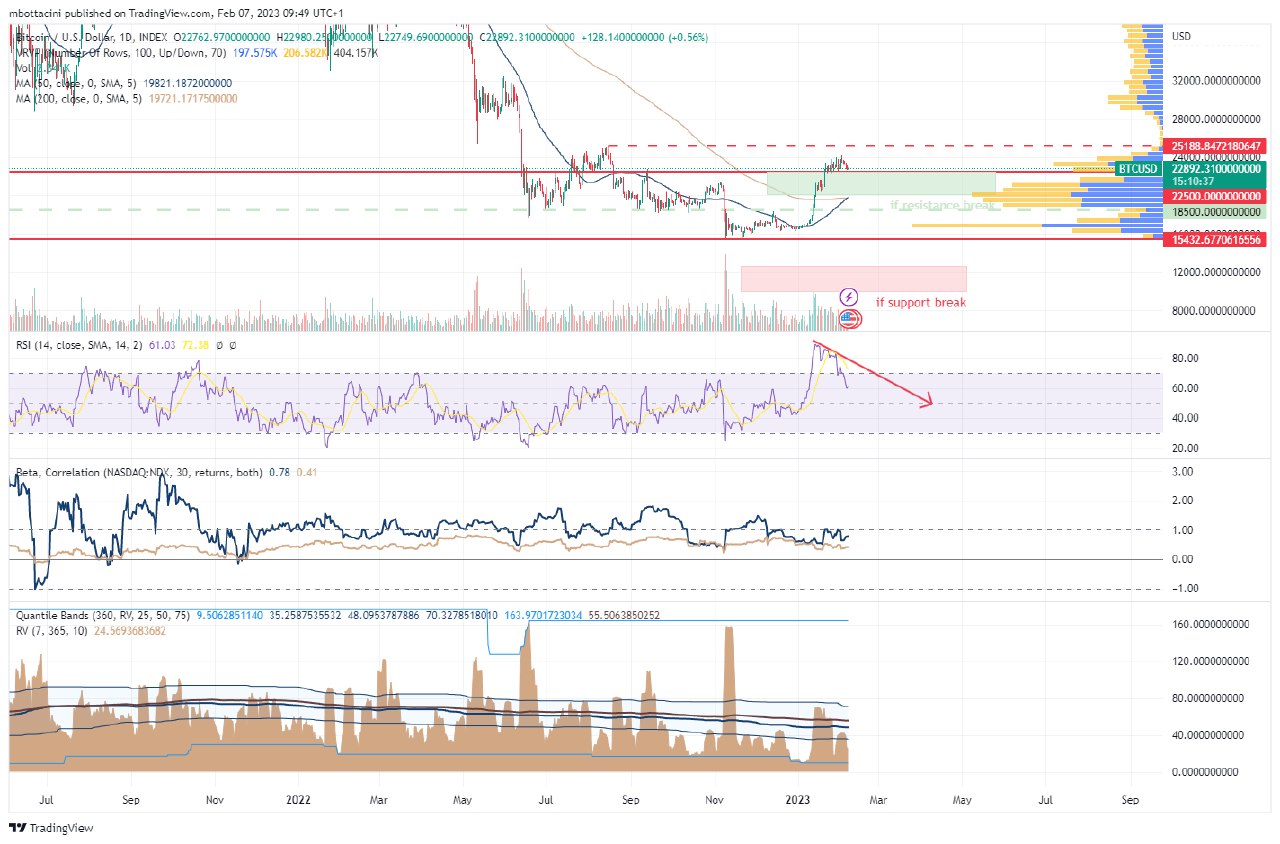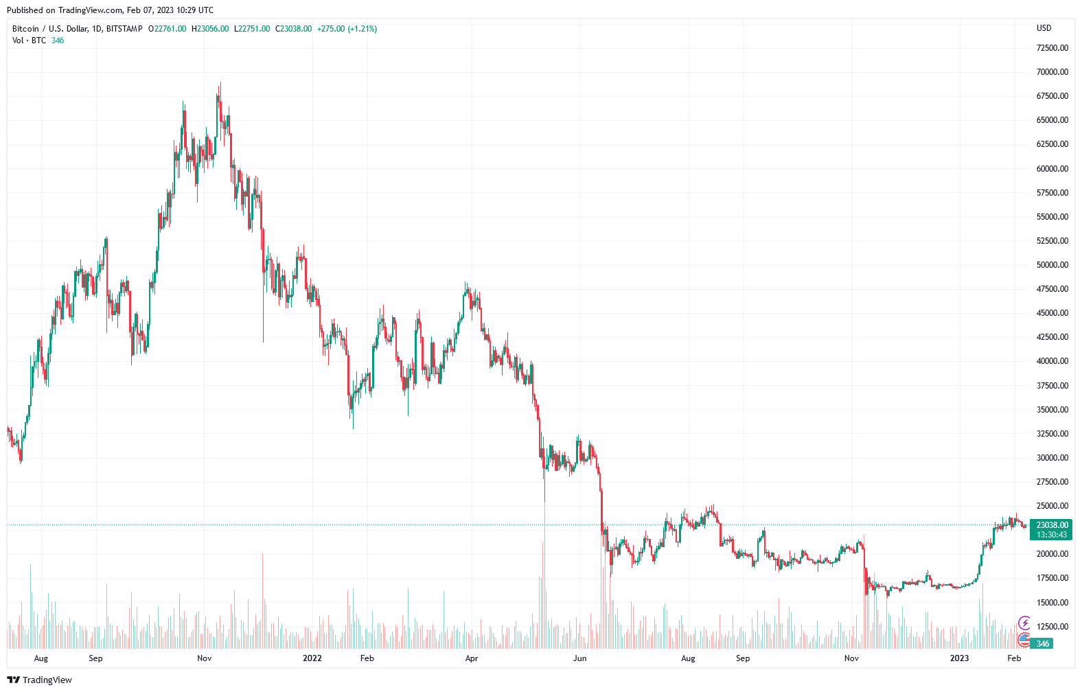 Am Freitag fielen dann die US-Arbeitsmarktdaten mit 517k gegenüber der Erwartung deutlich besser aus als die erwarteten 185k und einer Arbeitslosenquote von 3.4%. Aber die Risikopapiere gingen nicht wirklich zurück, nur der US Dollar stieg leicht an und der DXY liegt jetzt bei 103.57 (+1.46% WoW). Der DOT-PLOT sieht das Zinsziel zum Jahresende immer noch bei 475-500 Basispunkten (d.h. eine Anhebung um 25 Basispunkte), während der Median bei 500-525 Basispunkten liegt. Die Rendite für 2-jährige US-Staatsanleihen liegt bei 4.423% (+22.5 WoW). Daran hat sich nicht viel geändert.