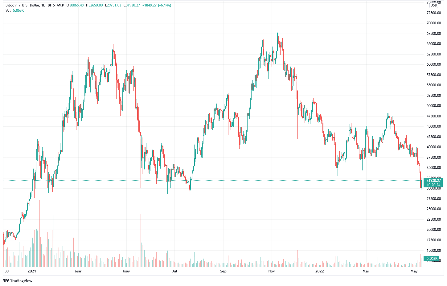 - Am 10. Mai (in den frühen MEZ-Stunden) setzte sich die UST-Entkopplung fort und wurde der Stablecoin wurde zu 0.6018 USD gehandelt. Zur gleichen Zeit überschritt BTC die Marke von 30k USD und LUNA erreichte 23.48 USD.
