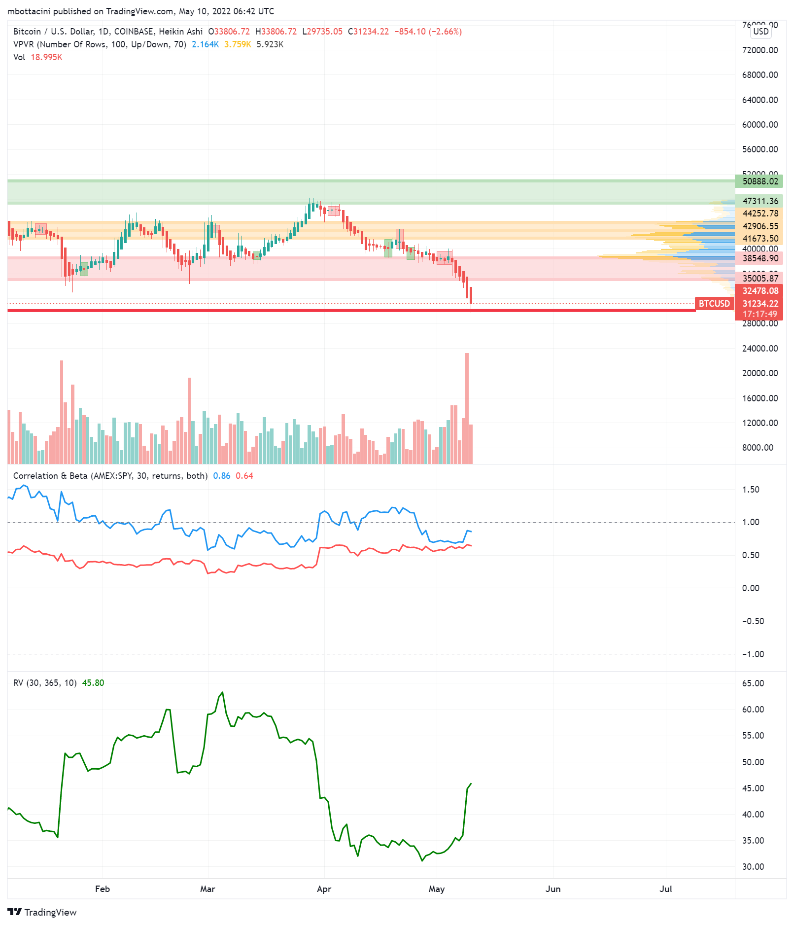 - Am 5. Mai erklärte die Bank von England (BoE), dass die Inflation im Vereinigten Königreich im vierten Quartal 10% erreichen könnte, dass das BIP wahrscheinlich bei -1% liegen würde und dass wir 2023 eine ganzjährige Kontraktion erleben würden. BTC näherte sich der oberen 35k USD-Widerstandsmarke.