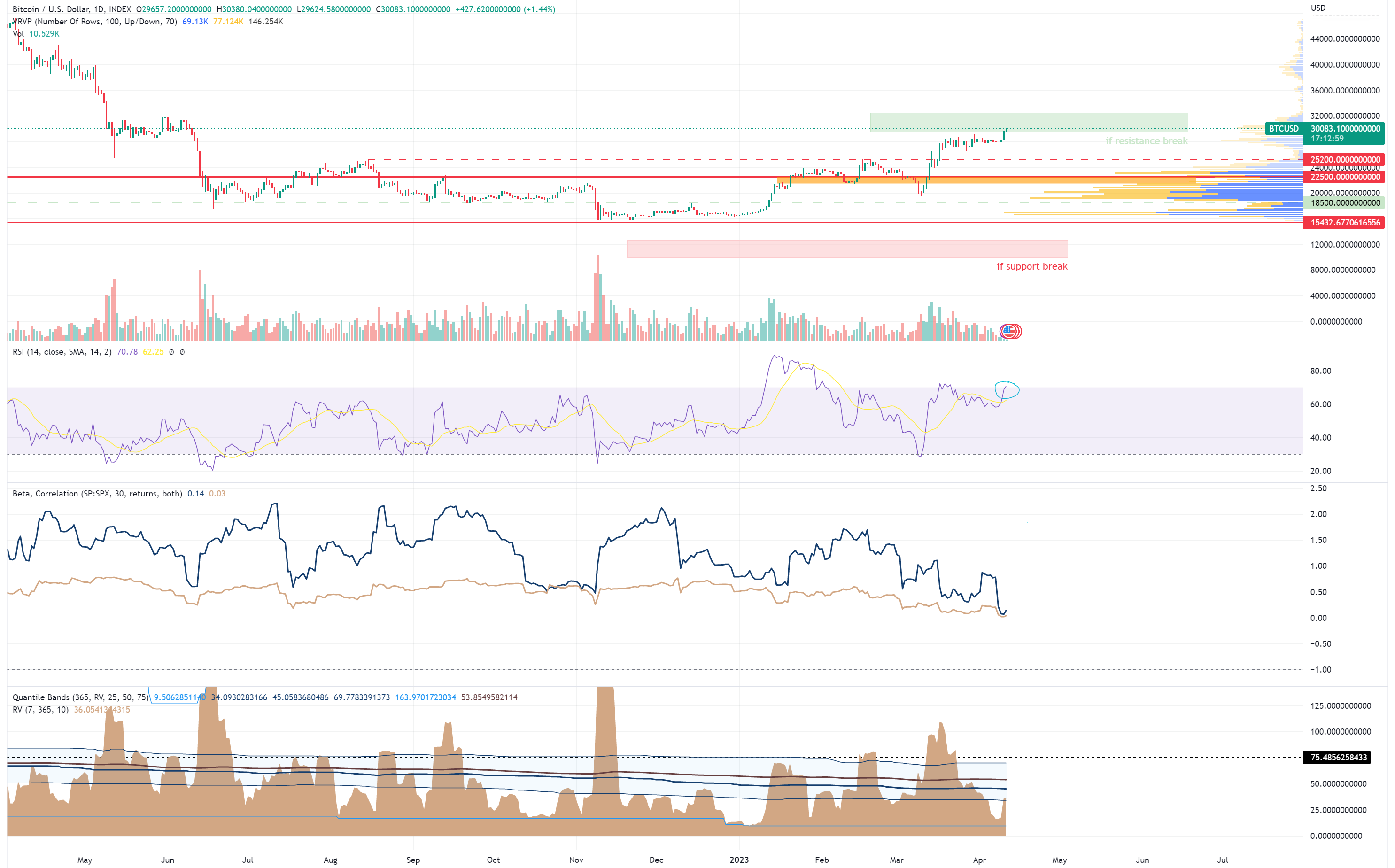 Bitcoin hat sich besonders gut entwickelt und zum ersten Mal seit Juni letzten Jahres wieder die USD 30k-Marke erreicht. Trotzdem sind die Handelsvolumina nach wie vor gering, was darauf hindeutet, dass nur wenige nach dem Jahrestief Gewinne mitnehmen. Neue Käufer sind immer noch zögerlich, in den Markt einzusteigen. Der Relative Strength Index (RSI) hat den überkauften Bereich bei 70 erreicht, was darauf hindeutet, dass sich das Momentum seinem Höhepunkt nähert. Das gleitende 30-Tage-Beta und die Korrelation mit dem S&P 500 sind auf einem 1-Jahres-Tief und bewegen sich um den Wert 0. Dies deutet darauf hin, dass Bitcoin derzeit entweder als "monetäre Alternative" oder als "digitales Gold" angesehen wird, anstatt eng an die traditionellen Aktienmarktbewegungen gebunden zu sein. Auf diese Weise wird der Preis in die Höhe getrieben.