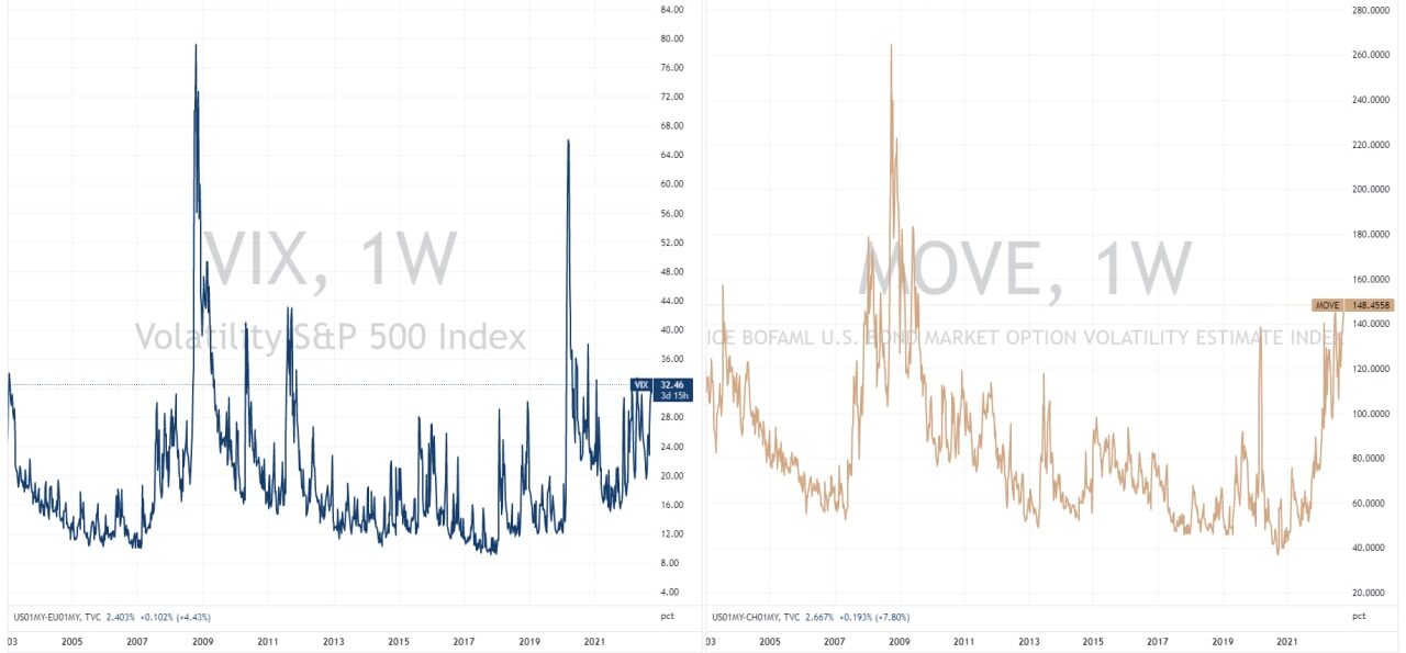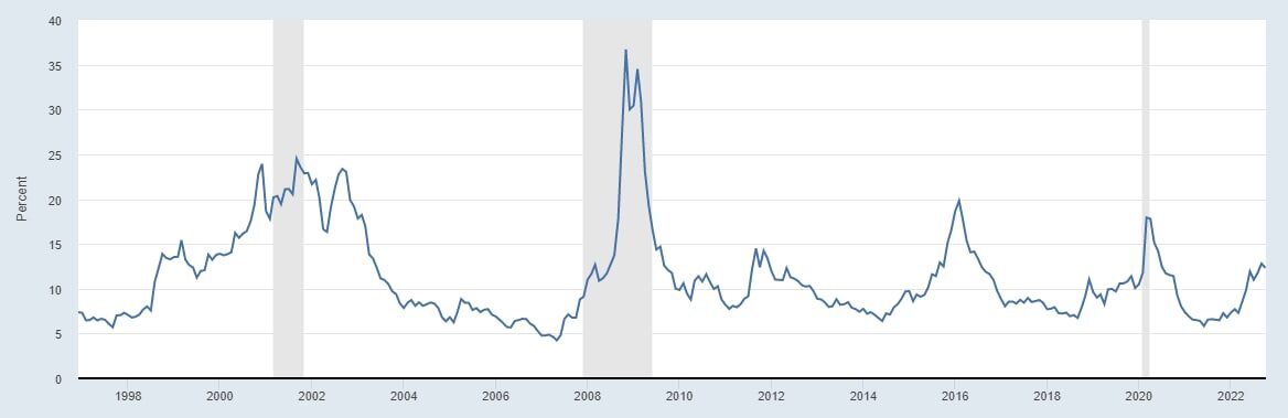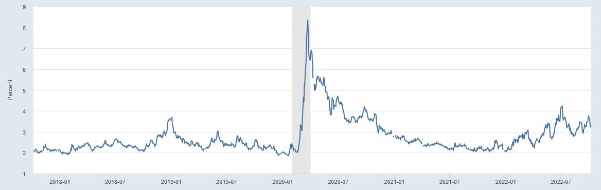 Ich rechne nicht damit, dass die Fed in nächster Zeit umschwenken wird. Es ist sehr wahrscheinlich bei der Sitzung am 2. November als auch bei der Sitzung am 14. Dezember einen weiteren Zinsschritt von 2x 75 Basispunkten erleben werden. Damit wird der Zielsatz zum Jahresende bei 425-450 Basispunkten liegen. Die Finanzmärkte, insbesondere die FX und FI-Märkte, sind sehr angespannt. Die Aktien halten sich jedoch erstaunlich gut. Der ICE BofA CCC & Lower US High Yield Index Option-Adjusted Spread stieg von 7.34% im Januar 2022 auf 12.32%, während er im März 2020 bei 17.79% und im März 2008 bei 36.7% lag.