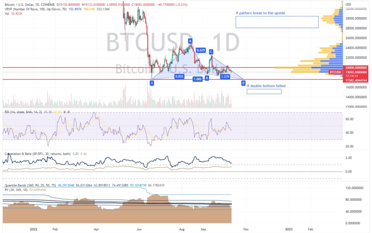 Ein Blick auf den Spot-Chart: BTC/USD hält das XABCD-Muster und wenn er sich 17'500 USD (Unterstützung) nähert, würde der Doppelboden getestet werden. Der RSI ist neutral und 20k USD ist wieder einmal der Widerstand.