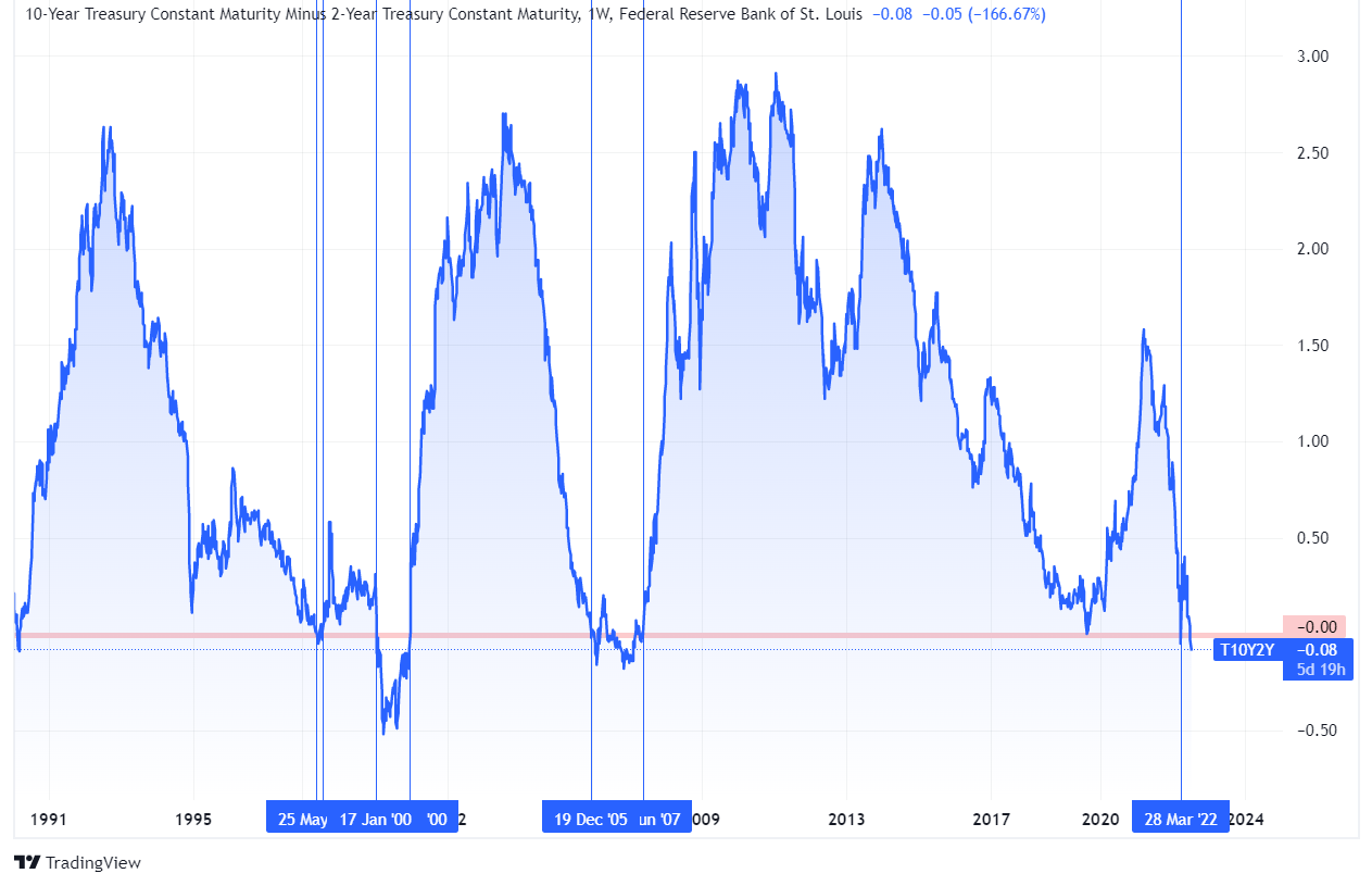 Die Preise und die Nachfrage kühlen nun ab. Deshalb verlangsamt sich die Wirtschaft und wird sich weiter abschwächen. Auch die Terminstruktur der US-Renditen (10-jährige US-Renditen minus 2-jährige US-Renditen) ist - wieder einmal - invertiert. Sollte am Ende des nächsten Quartals ein rückläufiges BIP zu verzeichnen sein, wird die Verlangsamung der US-Wirtschaft "offiziell" in eine Rezession umschlagen.