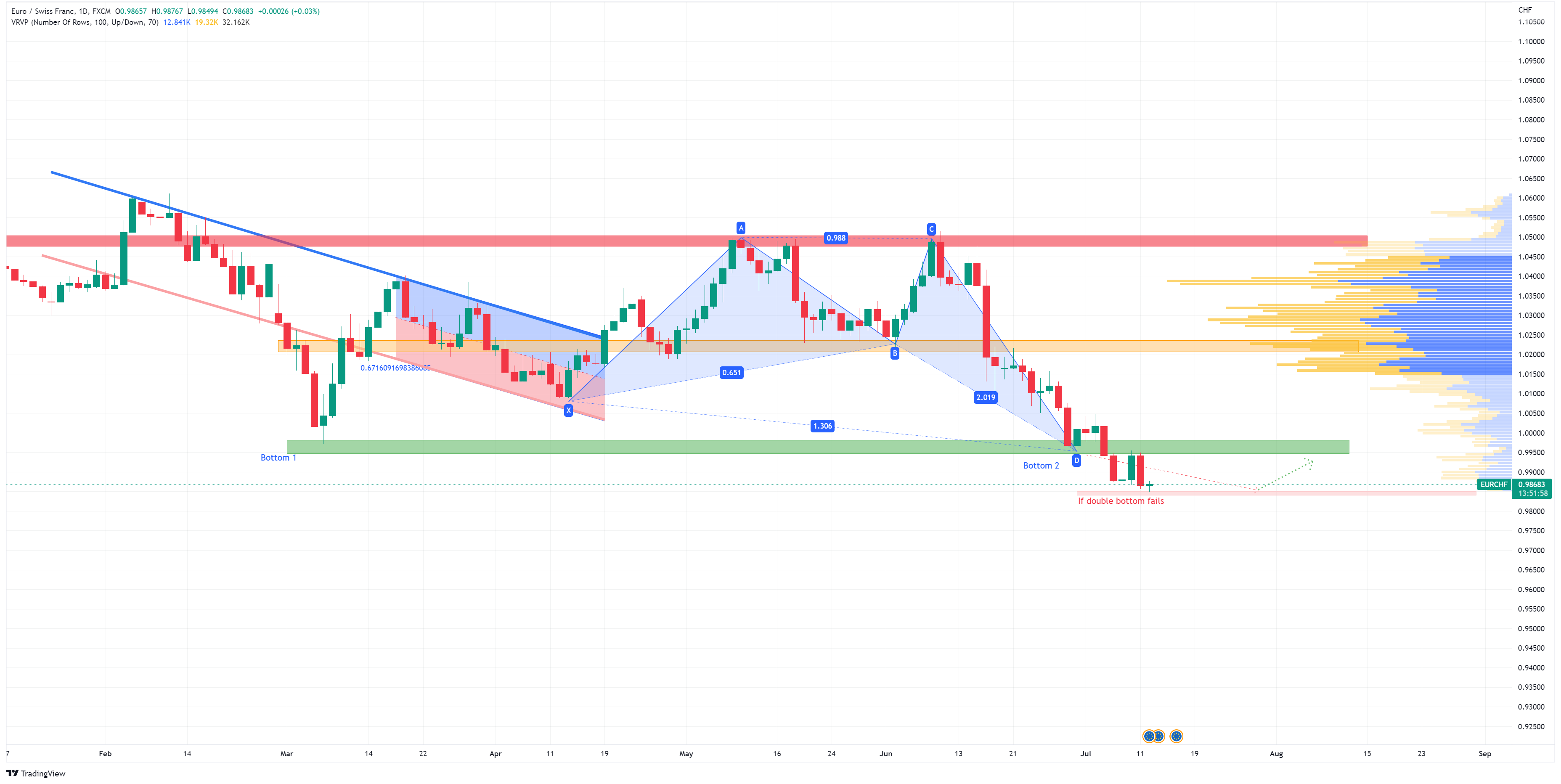 Letzte Woche habe ich einen Handel auf EUR/CHF genannt. Ich will diesen nun bestätigen. Der "Double Bottom" hält nicht und wir nähern uns jetzt der aktuellen Unterstützung bei 0.985. Mit meinem neuen Einstiegspunkt bei 0.985, ist das Schlussziel die vorherige Unterstützung: 0.998 (neuer Widerstand). Der USD wird immer stärker und die Eurozone schlittert "langsam" in eine Krise. Ich rechne deshalb mit einem EUR/USD unter der Parität. Es bleibt nur offen, ob die EZB mit der Beschliessung einiger ernsthafter und schneller Entscheidungen beginnt (d.h. Straffung der Bilanz, Anhebung der Zinssätze, "Klärung" der Zukunft der EU usw.).
