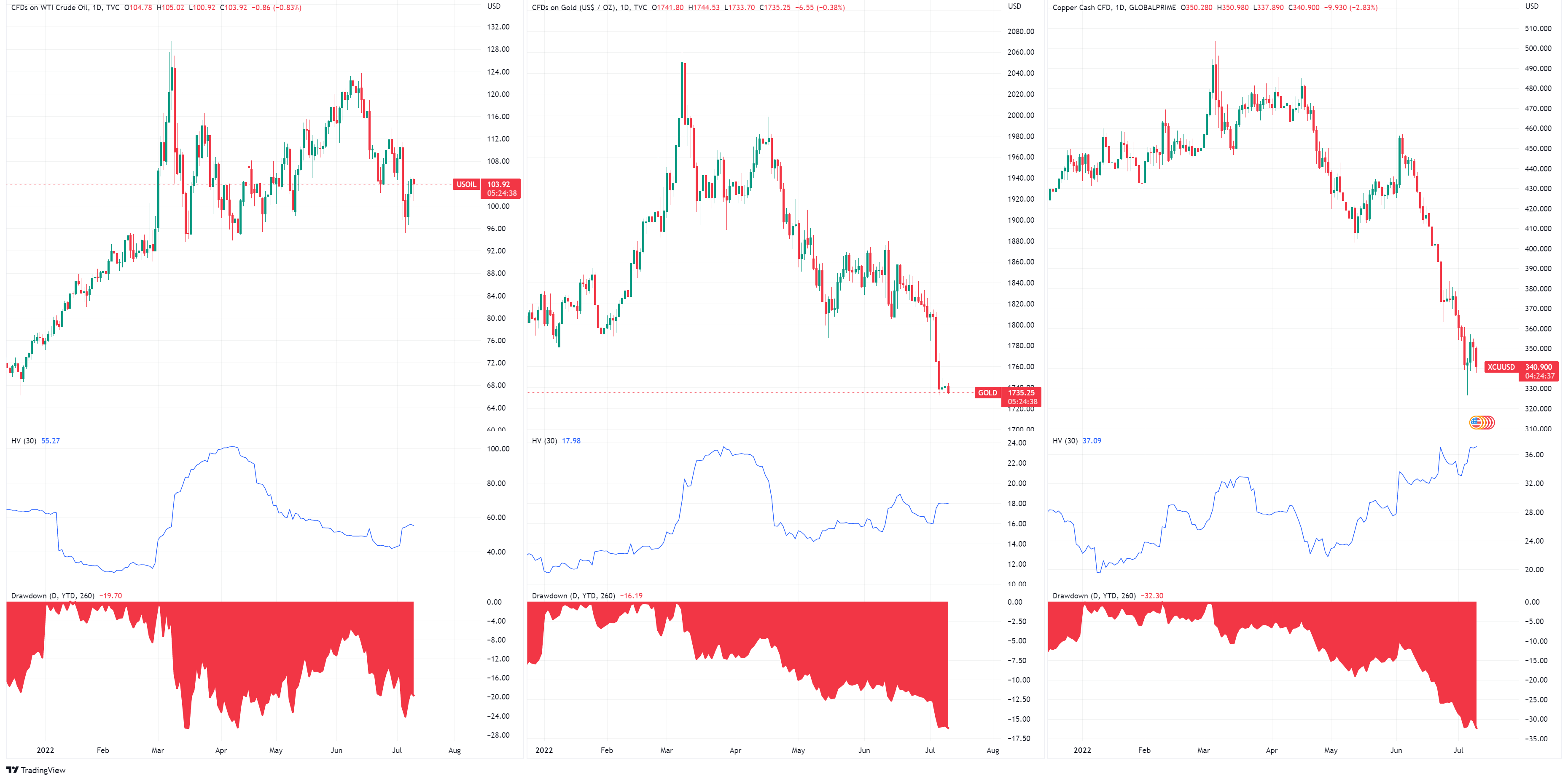 Da der USD im Jahr 2022 weiterhin zu den stärksten Vermögenswerten zählt, belasten die Juni-Aktualisierungen bereits die Rohstoffe. WTI-Rohöl (Rückgang: -19.7% im Jahresverlauf), Gold (Rückgang: -16.19% im Jahresverlauf) und Kupfer (Rückgang: -32.3% im Jahresverlauf).